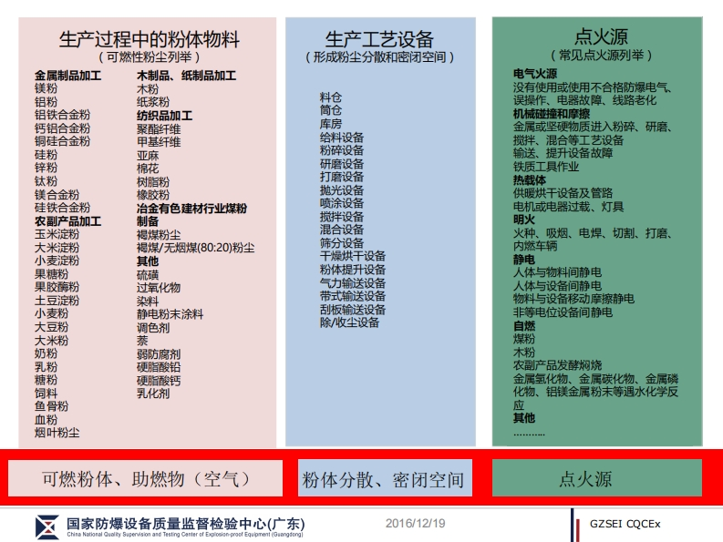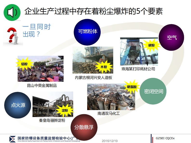 广州特种机电设备检测研究院GUWNGZHOU ACADEMY OF SPECIAL EQUPNENT INSPECTION TESTINGGZSEI CQCEx国家防爆设备质量监督检验中心(广东)China National Quality Supervision and Testing Center of Explosion-proof Equipment(Guangdong)粉尘爆炸防控设备NQ关键技术及使用安全我国粉尘防爆问题的思考与建议NQI Key Technology and Usage Safety of Dust Explosion-proof-Thoughts and Proposals on Dust Explosion-proof in China王新华博士2016年12月16日广州第八届全国防爆设备管理与安全技术研讨会