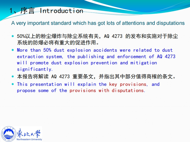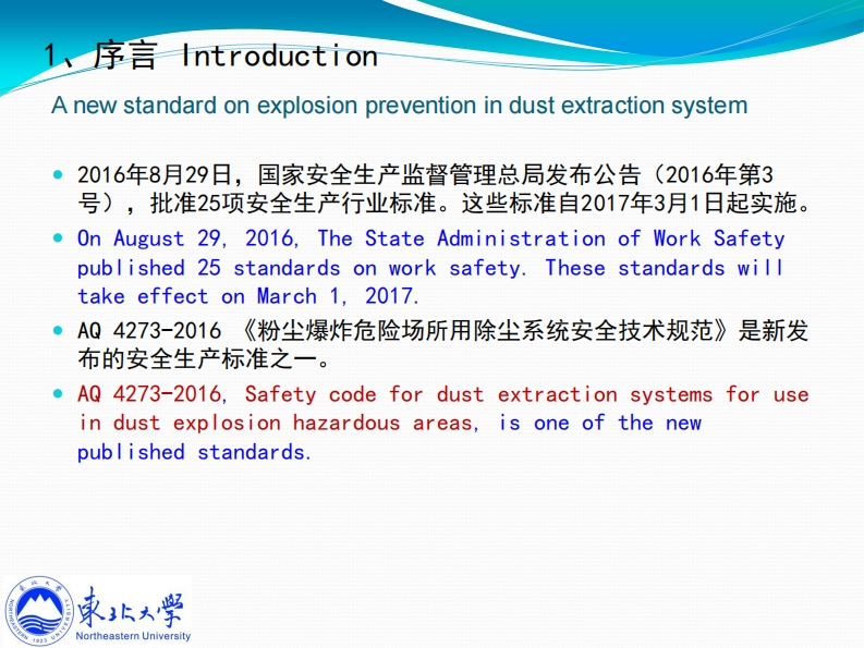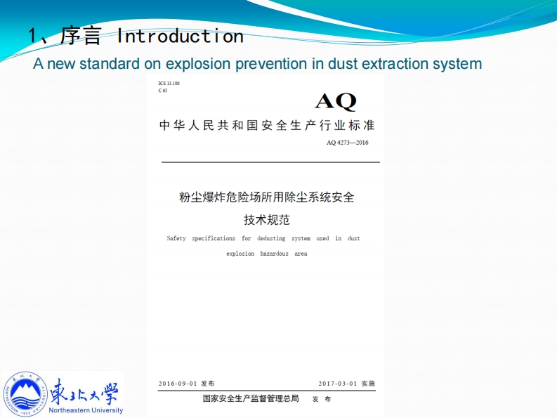 2016工业爆炸与安全防护技术(广东)论坛,2016每12月15日《AQ4273粉尘爆炸危险场所除尘系统安全技术规范》解读Explanation of AQ 4273 "Safety code for dustextraction systems for use in dust explosionhazardous areas钟圣俊Shengjun Zhongzhongsj@smm.neu.edu.cn13072498962http://iepi.neu.edu.cn家北大学东北大学工业爆炸及防护研究所Northeastern UniversityIndustrial Explosion Protection Institute,Northeastern University