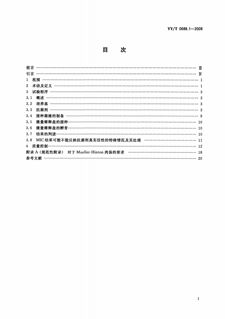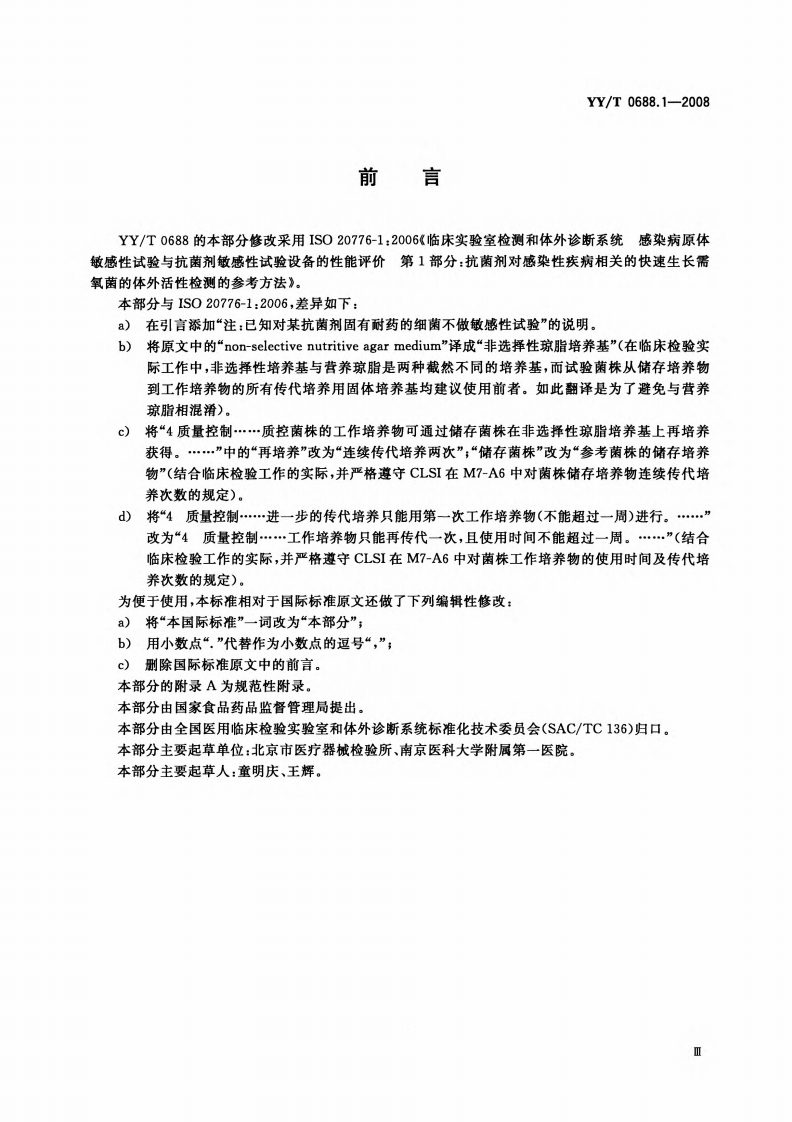 ICS11.100C44YY中华人民共和国医药行业标准YY/T0688.1-2008临床实验室检测和体外诊断系统感染病原体敏感性试验与抗菌剂敏感性试验设备的性能评价第1分:抗菌剂对感染性疾病相关的快速生长需氧菌的体外活性检测的参考方法Clinical laboratory testing and in vitro diagnostic test systems-Susceptibility testing of infectious agents and evaluation ofperformance of antimicrobial susceptibility devices-Part 1:Reference method for testing the in vitro activity ofantimicrobial agents against rapidlygrowing aerobic bacteria involved in infectious diseases(IS020776-1:2006,MOD)2008-10-17发布2010-01-01实施国家食品药品监督管理局发布