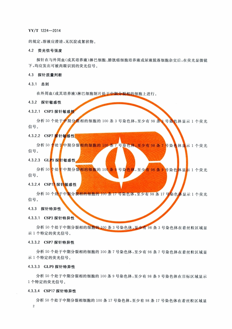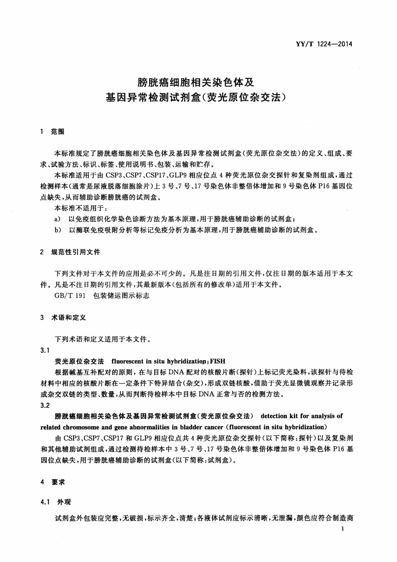 ICS11.100C44YY中华人民共和国医药行业标准YY/T1224-2014膀胱癌细胞相关染色体及基因异常检测试剂盒(荧光原位杂交法)Detection kit for analysis of related chromosome andgene abnormalities in bladder cancer (Fluorescent in situ hybridization2014-06-17发布2015-07-01实施国家食品药品监督管理总局发布Φ房