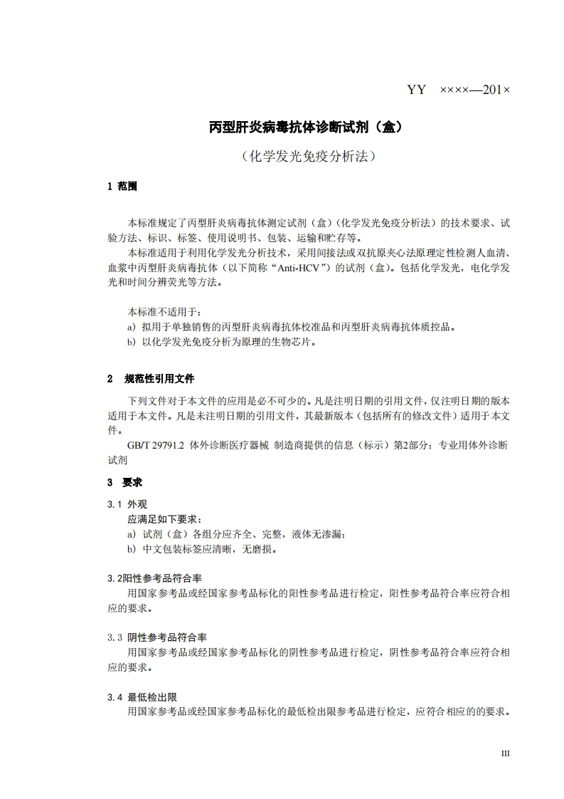 丙型肝炎病毒抗体检测试剂盒(化学发光免疫测定法)HepatitisCVirusAntibody(Anti-HCV)DetectionKit(ChemiluminescentImmunoassay)(征求意见版本)348072@abc前天发布关注私信0.54MB9页026丙型肝炎病毒抗体检测试剂盒(化学发光免疫测定法)HepatitisCVirusAntibody(Anti-HCV)DetectionKit(ChemiluminescentImmunoassay)(征求意见版本)此内容为付费资源,请付费后查看¥13¥19黄金会员免费钻石会员免费立即购买您当前未登录!建议登陆后购买,可保存购买订单付费资源 第1页 / 共9页 第2页 / 共9页 第3页 / 共9页 第4页 / 共9页 第5页 / 共9页 试读已结束,还剩4页,您可下载完整版后进行离线阅读 THE END标准规范 文本预览 ICS11.100C:44YY中华人民共和国医疗器械行业标准YY××××—201×丙型肝炎病毒抗体检测试剂(盒)(化学发光免疫分析法)Hepatitis C Virus Antibody (Anti-HCV)Detection Reagent (kit)(Chemiluminescent Immunoassay)(征求意见稿)201X-XX-XX发布201X-XX-XX实施国家食品药品监督管理局发布 查看更多 收起部分 喜欢就支持一下吧收藏