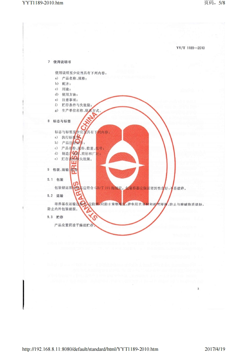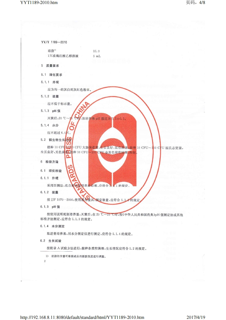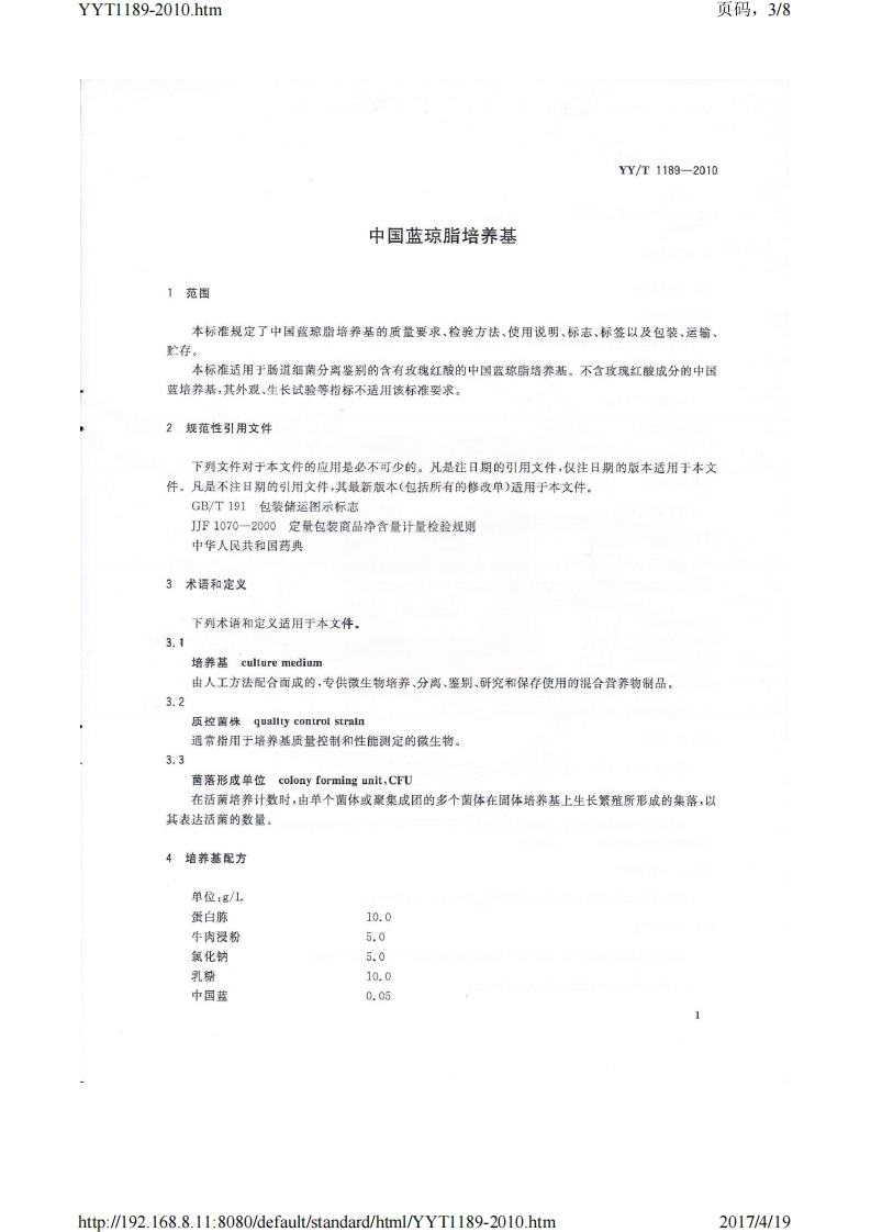 中国蓝琼脂培养基Chinablueagarmedium348072@abc前天发布关注私信7.22MB8页051中国蓝琼脂培养基Chinablueagarmedium此内容为付费资源,请付费后查看¥13¥19黄金会员免费钻石会员免费立即购买您当前未登录!建议登陆后购买,可保存购买订单付费资源 第1页 / 共8页 第2页 / 共8页 第3页 / 共8页 第4页 / 共8页 第5页 / 共8页 试读已结束,还剩3页,您可下载完整版后进行离线阅读 THE END标准规范 文本预览 YYT1189-2010.htm页码,1/8ICs11.100C44YY中华人民共和国医药行业标准YY/T1189-2010中国蓝琼脂培养基China blue agar medium2010-12-27发布2012-06-01实施国家食品药品监督管理局发布http://192.168.8.11:8080/default/standard/html/YYT1189-2010.htm2017/4/19 查看更多 收起部分 喜欢就支持一下吧收藏