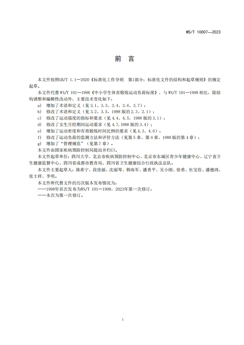 中小学生体育锻炼运动负荷卫生要求Hygienicrequirementsforsportloadinphysicalexerciseofprimaryandmiddleschoolstudents348072@abc前天发布关注私信0.36MB8页042中小学生体育锻炼运动负荷卫生要求Hygienicrequirementsforsportloadinphysicalexerciseofprimaryandmiddleschoolstudents此内容为付费资源,请付费后查看¥13¥19黄金会员免费钻石会员免费立即购买您当前未登录!建议登陆后购买,可保存购买订单付费资源 第1页 / 共8页 第2页 / 共8页 第3页 / 共8页 第4页 / 共8页 第5页 / 共8页 试读已结束,还剩3页,您可下载完整版后进行离线阅读 THE END标准规范 文本预览 ICS13.100CCS C 56中华人民共和国卫生行业标准WS/T10007—2023代替S/T101一1998中小学生体育锻炼运动负荷卫生要求Hygienic requirements for sport load in physical exercise of primary andmiddle school students2023-12-15发布2024-05-01实施国家疾病预防控制局发布 查看更多 收起部分 喜欢就支持一下吧收藏