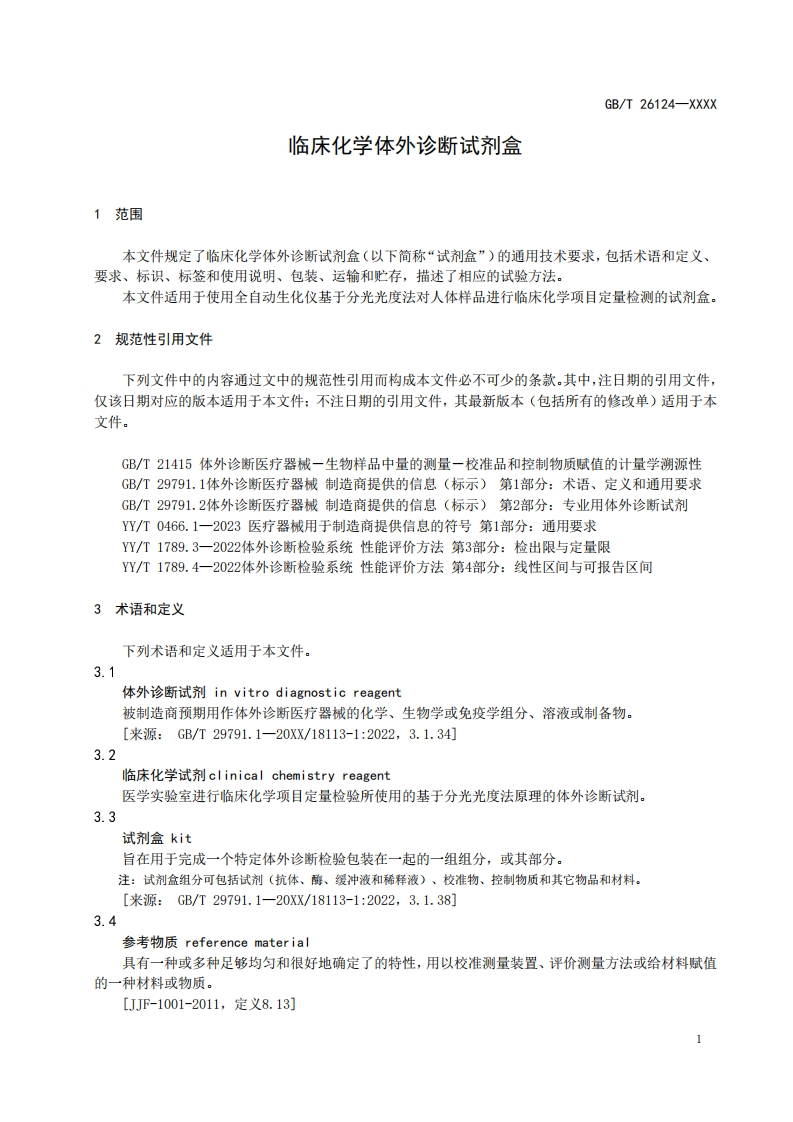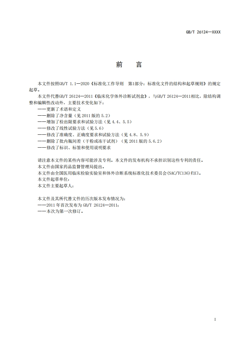 ICSCCS点击此处添加CCS号中华人民共和国国家标准GB/T 26124-XXXX代替GB/T26124一2011临床化学体外诊断试剂盒In vitro diagnostic reagent kit for clinical chemistry(点击此处添加与国际标准一致性程度的标识)(征求意见稿)2025年10月30日在提交反债意见时,请将您知道的相关专利连同支持性文件一并附上。XXXX-Xx-XX发布XXXX-Xx-XX实施国家市场监督管理登局发布国家标准化管理委员会