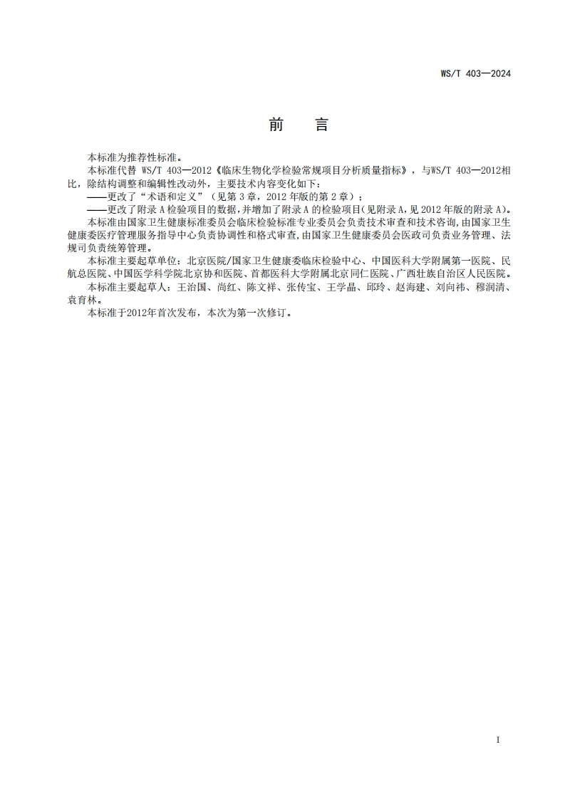 临床化学检验常见项目分析质量规范348072@abc昨天发布关注私信0.25MB9页035临床化学检验常见项目分析质量规范此内容为付费资源,请付费后查看¥13¥19黄金会员免费钻石会员免费立即购买您当前未登录!建议登陆后购买,可保存购买订单付费资源 第1页 / 共9页 第2页 / 共9页 第3页 / 共9页 第4页 / 共9页 第5页 / 共9页 试读已结束,还剩4页,您可下载完整版后进行离线阅读 THE END标准规范 文本预览 ICS11.020CCS C 50WS中华人民共和国卫生行业标准WS/T403-2024代替WS/T403一2012临床化学检验常用项目分析质量标准Analytical performance standard for routine analytes in clinical chemistry2024-05-09发布2024-11-01实施中华人民共和国国家卫生健康委员会发布 查看更多 收起部分 喜欢就支持一下吧收藏
