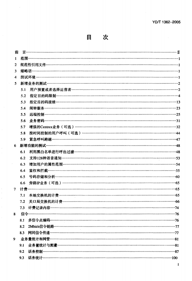 YD-T1362-2005348072@abc4个月前发布关注私信2.53MB103页043YD-T1362-2005此内容为付费资源,请付费后查看¥21¥31黄金会员免费钻石会员免费立即购买您当前未登录!建议登陆后购买,可保存购买订单付费资源 第1页 / 共103页 第2页 / 共103页 试读已结束,还剩101页,您可下载完整版后进行离线阅读 THE END标准规范 文本预览 YD中华人民共和国通信行业标准YD/T1362-2005电话交换设备总技术规范(补充件1)的测试方法Testing methods of the supplementary specification 1 toStore Program Control(SPC)2005-06-21发布2005-11-01实施中华人民共和国信息产业部发布 查看更多 收起部分 喜欢就支持一下吧收藏