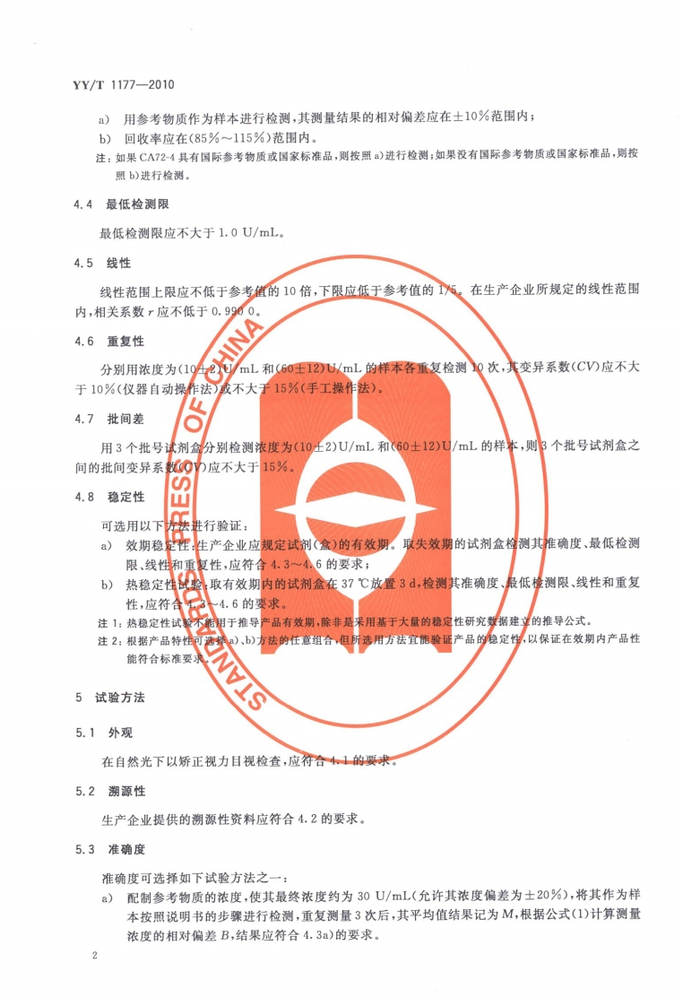 九原耳测疋介(品化学发光免疫分析法CancerantigenCA72-4quantitativedetectionreagent(kit)-Chemiluminescentimmunoassay发布2012-06-01实施国家食品药品监督管理局发布348072@abc3天前发布关注私信2.33MB9页047九原耳测疋介(品化学发光免疫分析法CancerantigenCA72-4quantitativedetectionreagent(kit)-Chemiluminescentimmunoassay发布2012-06-01实施国家食品药品监督管理局发布此内容为付费资源,请付费后查看¥13¥19黄金会员免费钻石会员免费立即购买您当前未登录!建议登陆后购买,可保存购买订单付费资源 第1页 / 共9页 第2页 / 共9页 第3页 / 共9页 第4页 / 共9页 第5页 / 共9页 试读已结束,还剩4页,您可下载完整版后进行离线阅读 THE END标准规范 文本预览 1CS11.100C44YY中华人民共和国医药行业标准YY/T1177-2010癌抗原CA72-4定量测定试剂(盒)化学发光免疫分析法Cancer antigen CA72-4 quantitative detection reagent (kit)-Chemiluminescent immunoassay2010-12-27发布2012-06-01实施国家食品药品监督管理局发布数码伪 查看更多 收起部分 喜欢就支持一下吧收藏