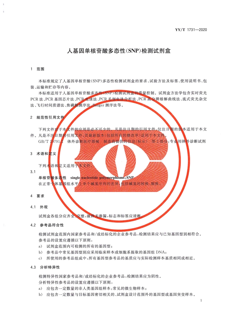 人基因单核苷酸多态性(SNP)测定试剂盒Humangenesinglenucleotidepolymorphisms(SNP)assaykit348072@abc3天前发布关注私信2.20MB8页038人基因单核苷酸多态性(SNP)测定试剂盒Humangenesinglenucleotidepolymorphisms(SNP)assaykit此内容为付费资源,请付费后查看¥13¥19黄金会员免费钻石会员免费立即购买您当前未登录!建议登陆后购买,可保存购买订单付费资源 第1页 / 共8页 第2页 / 共8页 第3页 / 共8页 第4页 / 共8页 第5页 / 共8页 试读已结束,还剩3页,您可下载完整版后进行离线阅读 THE END标准规范 文本预览 ICS11.040C44sYY中华人民共和国医药行业标准YY/T1731-2020人基因单核苷酸多态性(SNP)检测试剂盒Human gene single nucleotide polymorphisms (SNP)detection kit2020-06-30发布2021-06-01实施Φ国家药品监督管理局发布利峰理查真份 查看更多 收起部分 喜欢就支持一下吧收藏