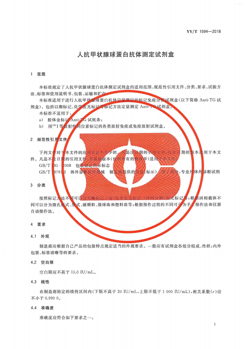 人抗甲状腺球蛋白抗体检测试剂盒Anti-TG定量标记免疫分析试剂盒348072@abc4天前发布关注私信1.54MB10页035人抗甲状腺球蛋白抗体检测试剂盒Anti-TG定量标记免疫分析试剂盒此内容为付费资源,请付费后查看¥13¥19黄金会员免费钻石会员免费立即购买您当前未登录!建议登陆后购买,可保存购买订单付费资源 第1页 / 共10页 第2页 / 共10页 第3页 / 共10页 第4页 / 共10页 第5页 / 共10页 试读已结束,还剩5页,您可下载完整版后进行离线阅读 THE END标准规范 文本预览 1428YY中华人民共和国医药行业标准YY/T1594-2018人抗甲状腺球蛋白抗体测定试剂盒Anti-TG quantitative labelling immunoassay kit2018-04-11发布2019-05-01实施国家药品监督管理局发布条层查真 查看更多 收起部分 喜欢就支持一下吧收藏