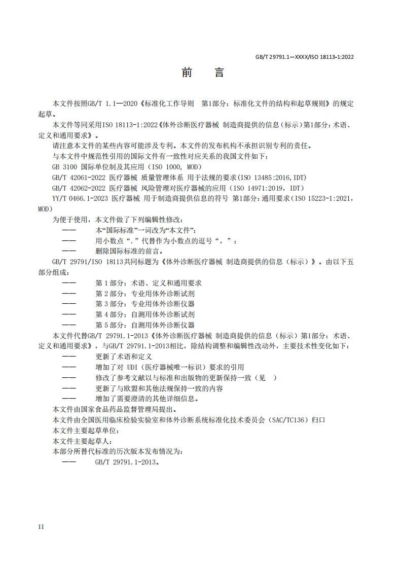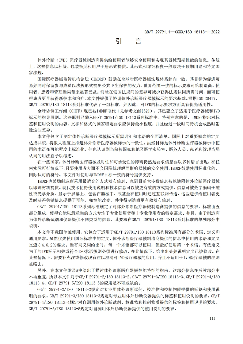 ICS11.100.10CCS c30B中华人民共和国国家标准GB/T29791.1-XXXX/1S018113-1:2022代替GB/T29791.1-2013体外诊断医疗器械制造商提供的信息(标示)第1部分:术语、定义和通用要求In vitro diagnostic medical devices-Information supplied by themanufacturer (labelling)-Part 1:Terms,definitions and general requirementsIS018113-1:2022,DT征求意见稿在提交反馈意见时,请将您知道的相关专利连同支持性文件一并附上。XXXX-XX-Xx发布XXXX-XX-XX实施国家市场监督管理总局国家标准化管理委员会发布