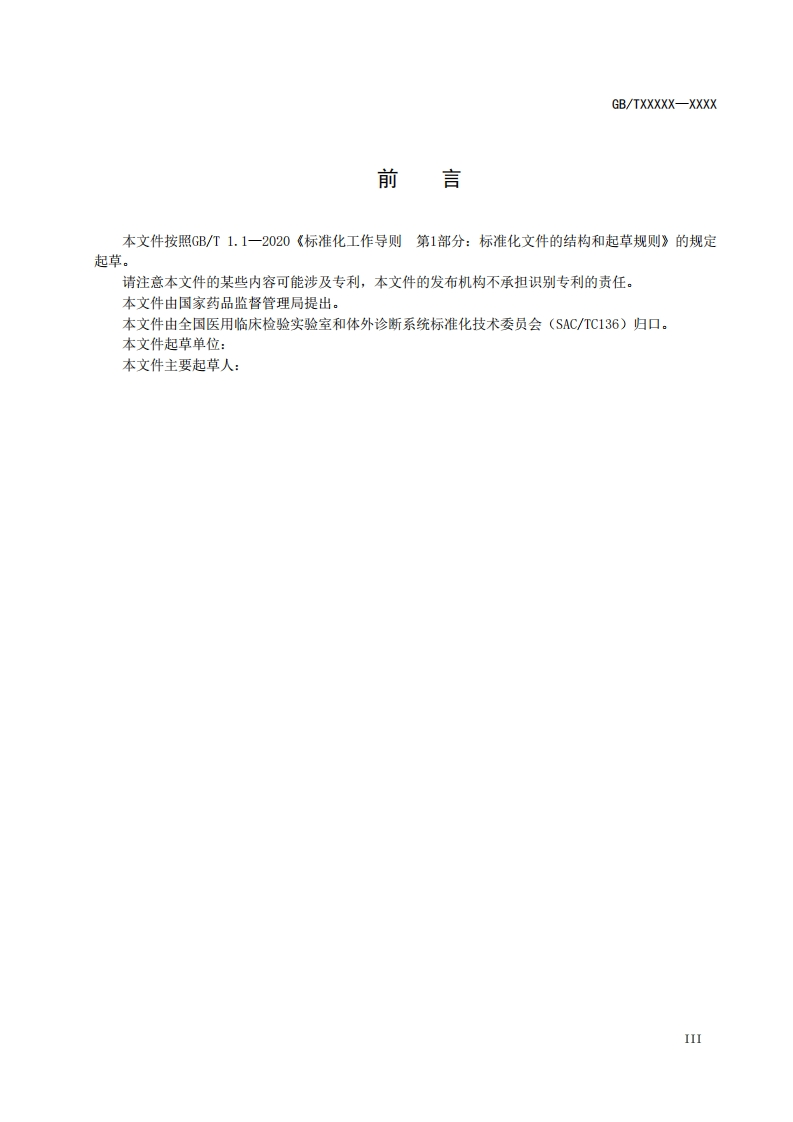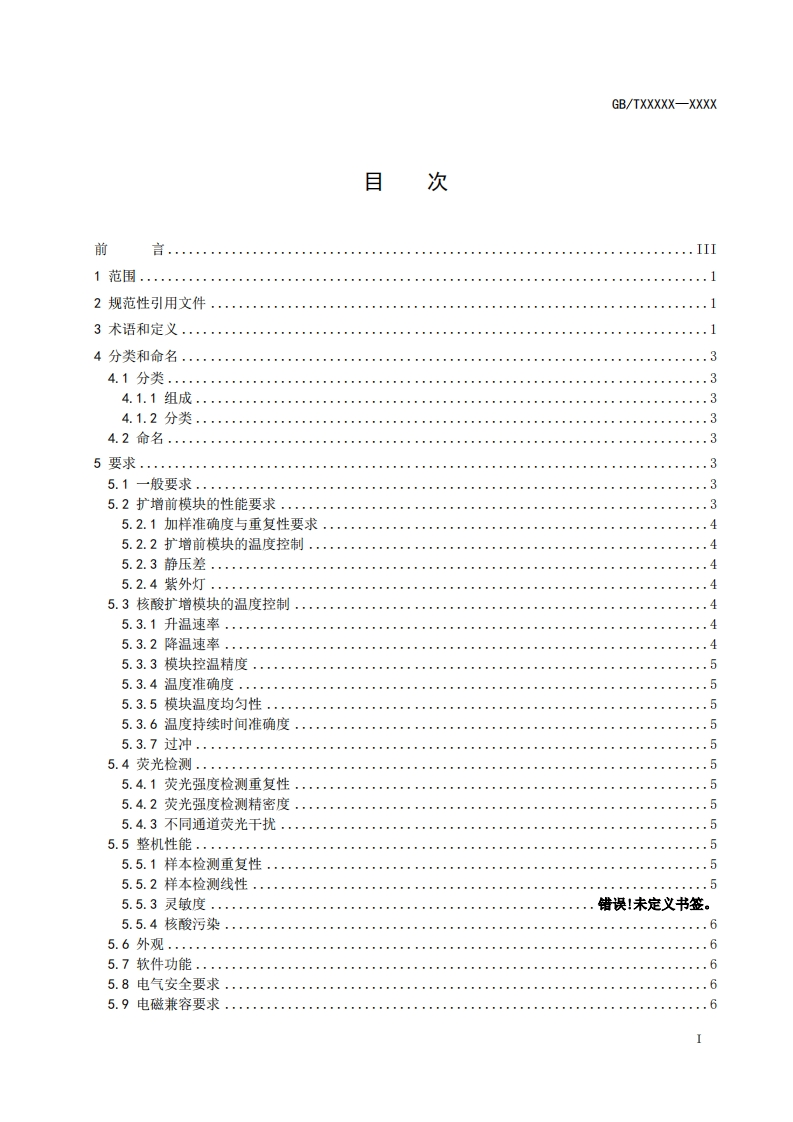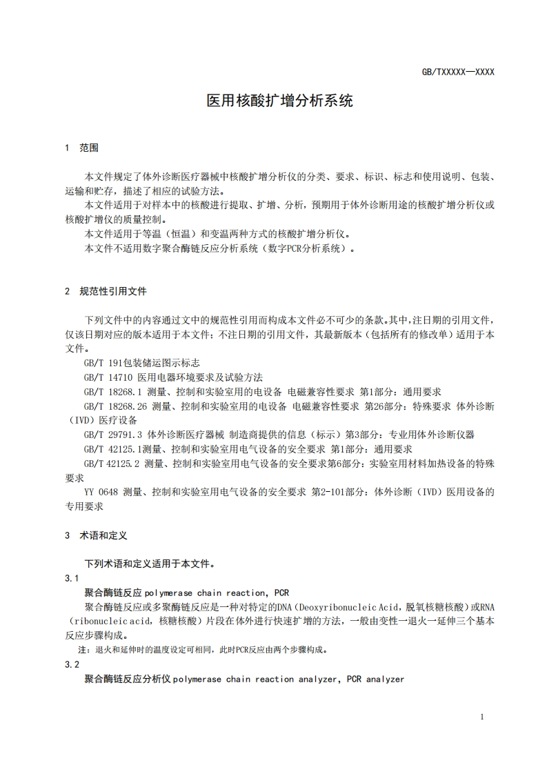 ICS11.100.10CCS C 44GB中华人民共和国国家标准GB/TXXXXX-XXXX体外诊断医疗器械核酸扩增分析仪In vitro diagnostic medical device -Nucleic acid amplification analyzer(点击此处添加与国际标准一致性程度的标识)(报批稿)(本草案完成时间:202408-31)在提交反债意见时,请将您知道的相关专利连同支持性文件一并附上。XXXX-XX-Xx发布XXXX-XX-XX实施国家市场监督管理登局发布国家标准化管理委员会