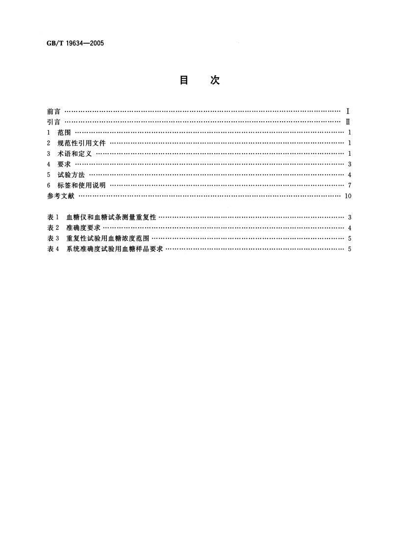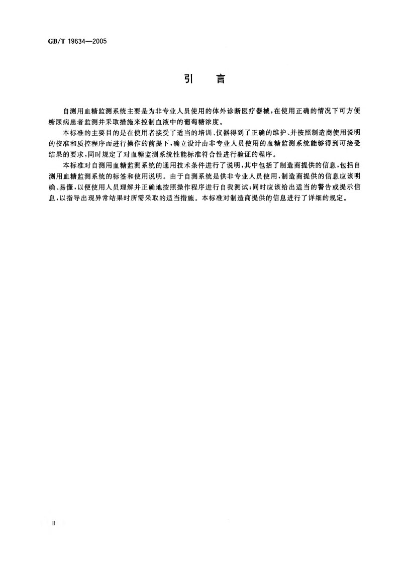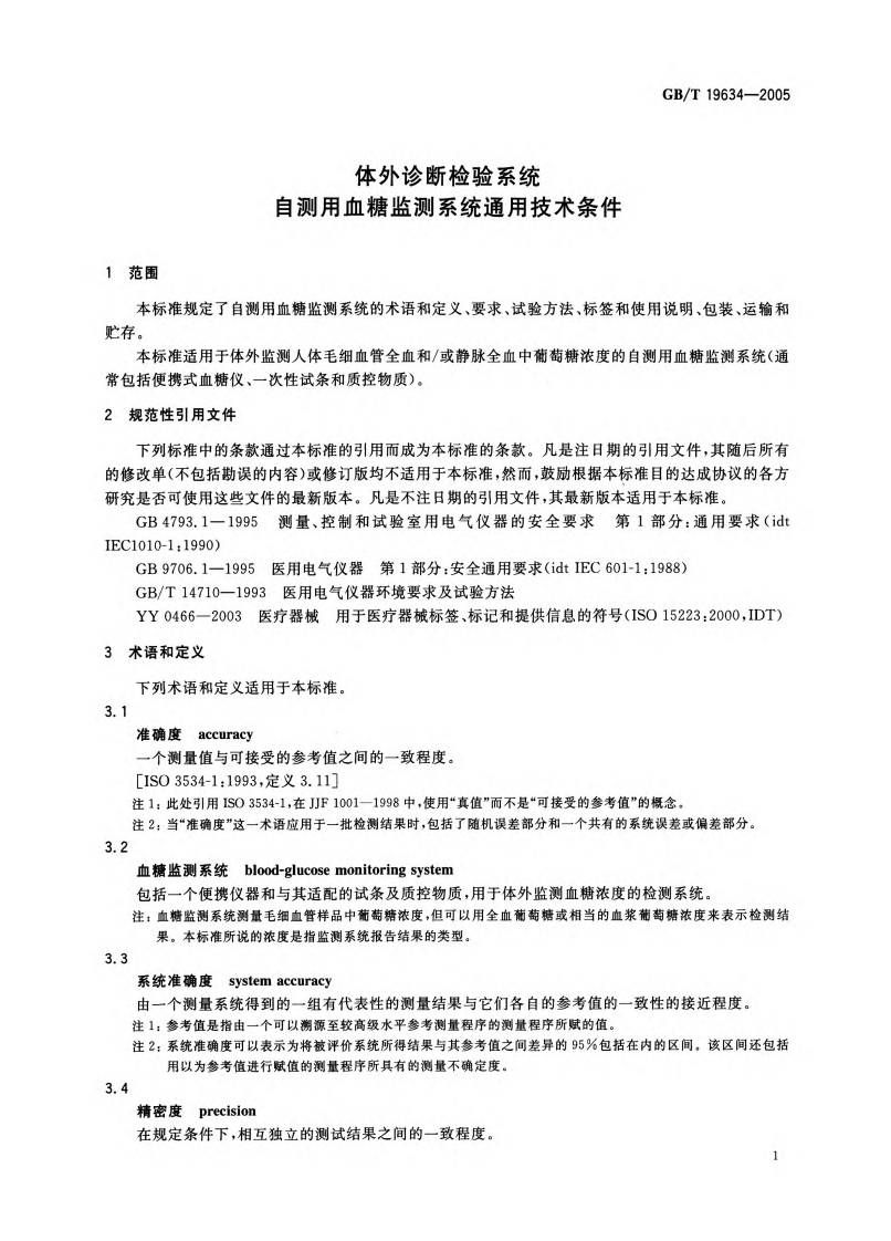 ICS11.100C44中华人民共和国国家标准GB/T19634-2005体外诊断检验系统自测用血糖监测系统通用技术条件In vitro diagnostic test systems-General technical requirements for blood-glucose monitoringsystems for self-testing(ISO15197:2003,NEQ)2005-01-24发布2005-05-01实施中华人民共和国国家质量监督检验检疫总局数码防伪中国国家标准化管理委员会发布