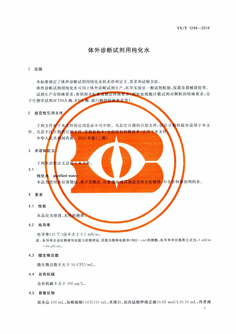 体外诊断试剂用纯净水Purifiedwaterforinvitrodiagnosticagents348072@abc6天前发布关注私信1.91MB7页049体外诊断试剂用纯净水Purifiedwaterforinvitrodiagnosticagents此内容为付费资源,请付费后查看¥13¥19黄金会员免费钻石会员免费立即购买您当前未登录!建议登陆后购买,可保存购买订单付费资源 第1页 / 共7页 第2页 / 共7页 第3页 / 共7页 第4页 / 共7页 第5页 / 共7页 试读已结束,还剩2页,您可下载完整版后进行离线阅读 THE END标准规范 文本预览 ICS11.100C44YY中华人民共和国医药行业标准YY/T1244-2014体外诊断试剂用纯化水Purified water for in vitro diagnostic reagents2014-06-17发布2015-07-01实施Φ丽国家食品药品监督管理总局发布 查看更多 收起部分 喜欢就支持一下吧收藏