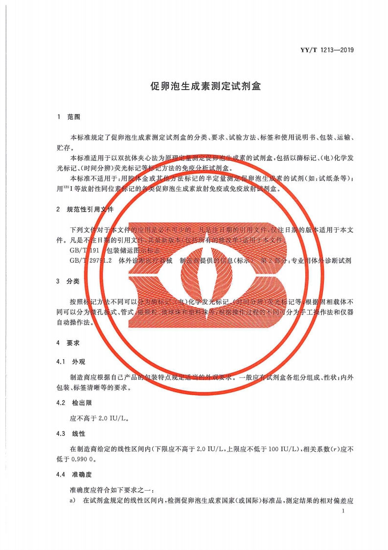促卵泡生成素测定试剂盒Folliclestimulatinghormonetestingkit348072@abc6天前发布关注私信1.61MB10页027促卵泡生成素测定试剂盒Folliclestimulatinghormonetestingkit此内容为付费资源,请付费后查看¥13¥19黄金会员免费钻石会员免费立即购买您当前未登录!建议登陆后购买,可保存购买订单付费资源 第1页 / 共10页 第2页 / 共10页 第3页 / 共10页 第4页 / 共10页 第5页 / 共10页 试读已结束,还剩5页,您可下载完整版后进行离线阅读 THE END标准规范 文本预览 ICS11.100C44YY中华人民共和国医药行业标准YY/T1213一2019代替YY/T1213-2013促卵泡生成素测定试剂盒Follicle stimulating hormone testing kit2019-05-31发布2020-06-01实施国家药品监督管理局发布 查看更多 收起部分 喜欢就支持一下吧收藏
