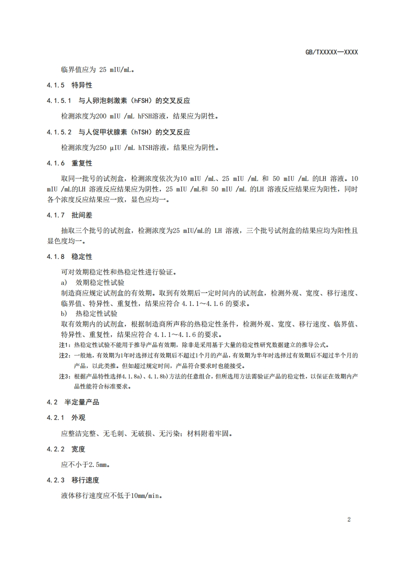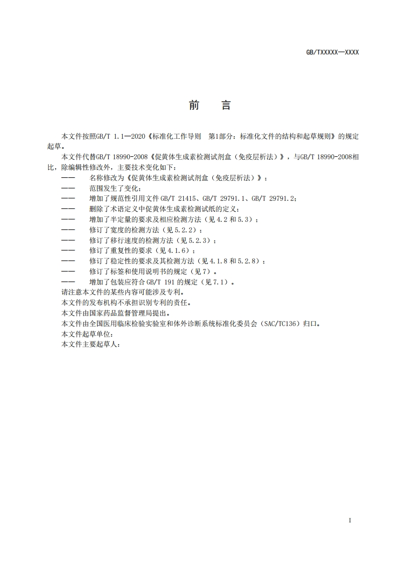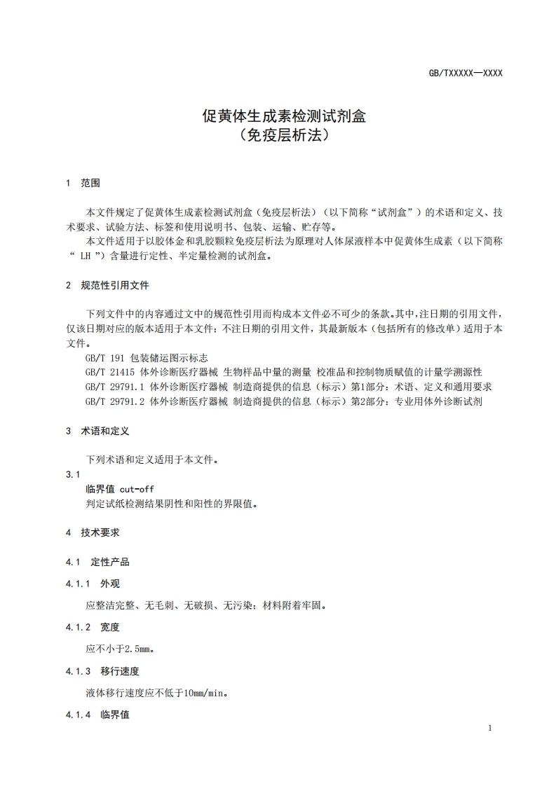 ICS11.100.10CCS C44中华人民共和国国家标准GB/TXXXXX-XXXX促黄体生成素检测试剂盒(免疫层析法)Luteinizing Hormone (LH)test kit (Immunochromatography assay)(点击此处添加与国际标准一致性程度的标识)草案版次选择在提交反债意见时,请将您知道的相关专利连同支持性文件一并附上。XXXX-XX-Xx发布XXXX-XX-XX实施国家市场监督管理总局发布国家标准化管理委员会