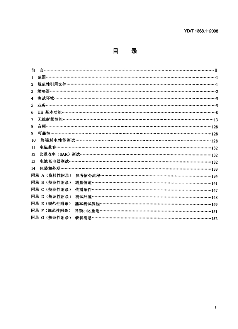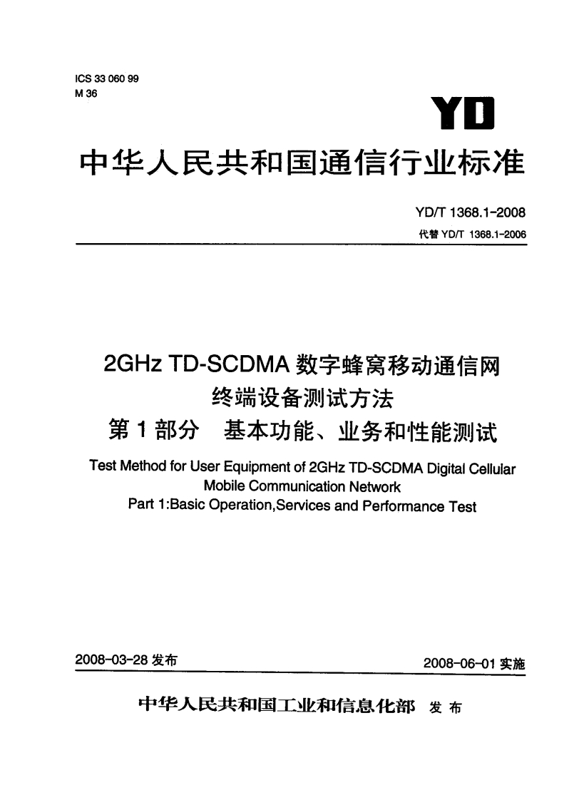 ICS3306099M36YD中华人民共和国通信行业标准YD/T1368.1-2008代替YD/T1368.1-20062 GHz tD-SCDMA数字蜂窝移动通信网终端设备测试方法第1部分基本功能、业务和性能测试Test Method for User Equipment of 2GHz TD-SCDMA Digital CellularMobile Communication NetworkPart 1:Basic Operation,Services and Performance Test2008-03-28发布2008-0601实施中华人民共和国工业和信息化部发布