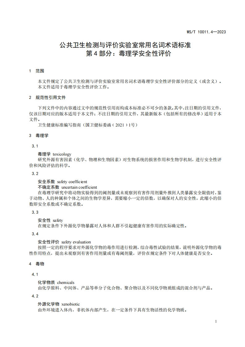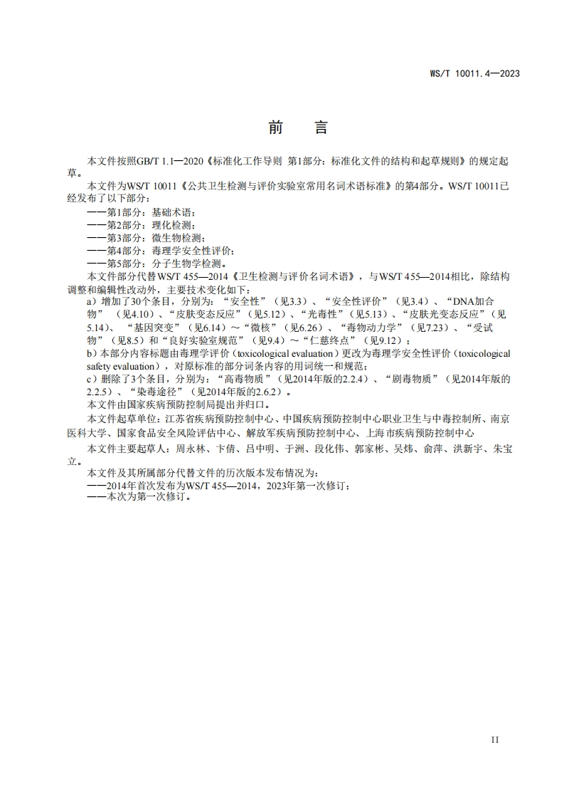 ICS11.020CCS C 61WS中华人民共和国卫生行业标准WS/T10011.4-2023部分代替WS/T455-2014公共卫生检测与评价实验室常用名词术语标准第4部分:毒理学安全性评价Standard of terms commonly used in public health testing and evaluation laboratoriesPart 4:Toxicological safety evaluation2023-12-15发布2024-05-01实施国家疾病预防控制局发布
