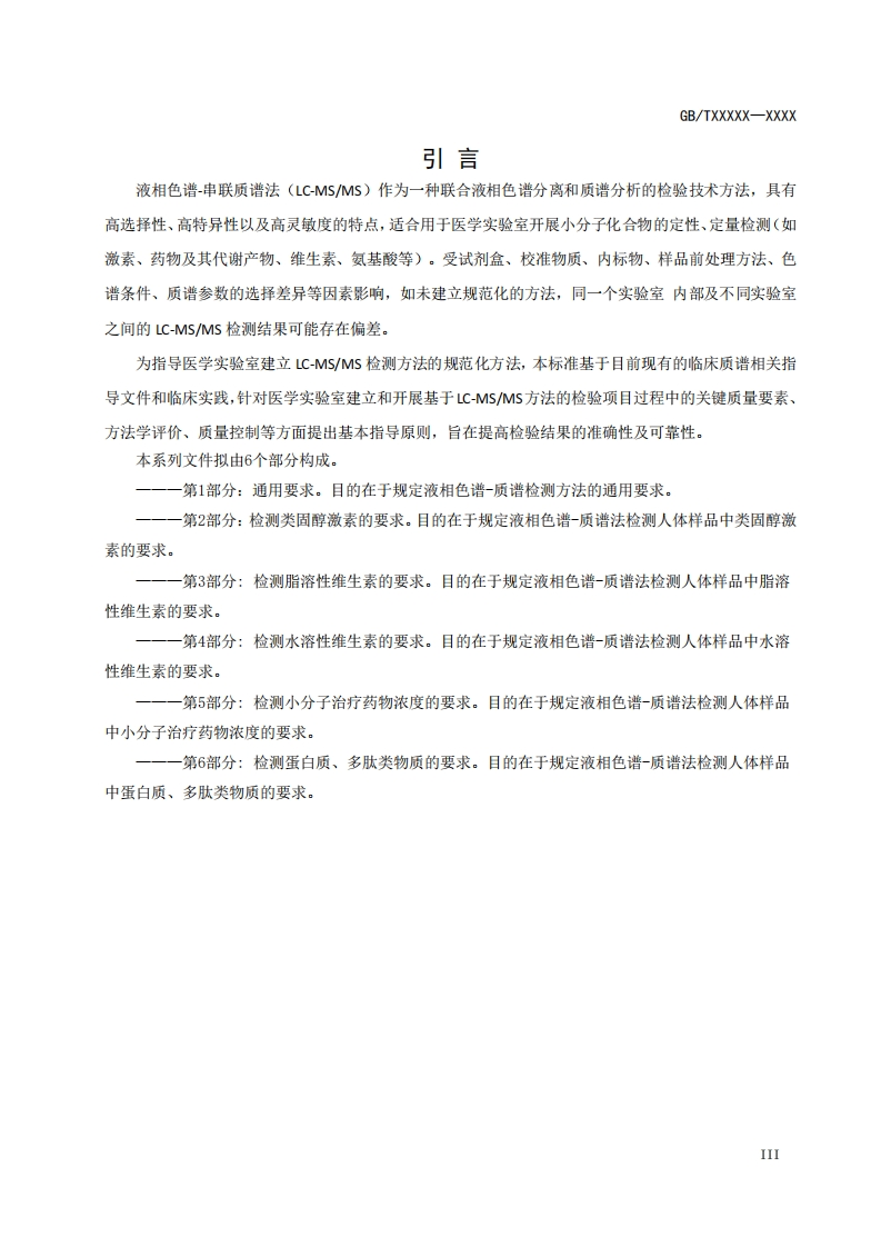 ICS11.100CCS C 30GB中华人民共和国国家标准GB/TXXXXX-XXXX医学实验室和体外诊断系统液相色谱-质谱检测方法第1部分:通用要求Medical laboratories and in vitro diagnostic systems -Liquid chromatography-mass spectrometry testing methods -Part 1:General requirements(点击此处添加与国际标准一致性程度的标识)草案版次选择(本草案完成时间:2024-08-31)在提交反馈意见时,请将您知道的相关专利连同支持性文件一并附上。XXXX-XX-XX发布XXXX-XX-XX实施国家市场监督管理总局发布国家标准化管理委员会