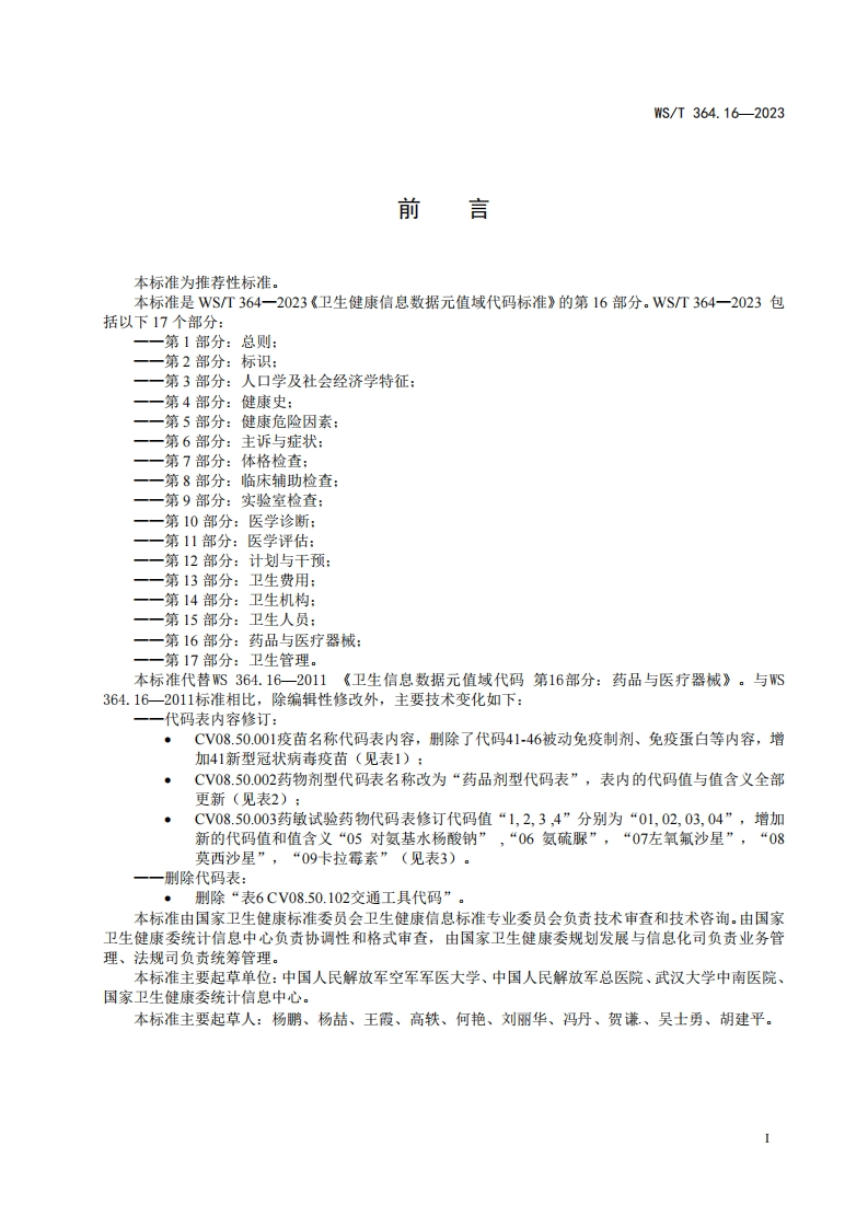 ICS11.020CCS C 07中华人民共和国卫生行业标准WS/T364.16-2023代替Ws364.16-2011卫生信息数据元值域代码第16部分药品与医疗器械Coding standard for value domain of health data element-Part 16:Drugs and medical devices2023-10-07发布2024-04-01实施中华人民共和国国家卫生健康委员会发布