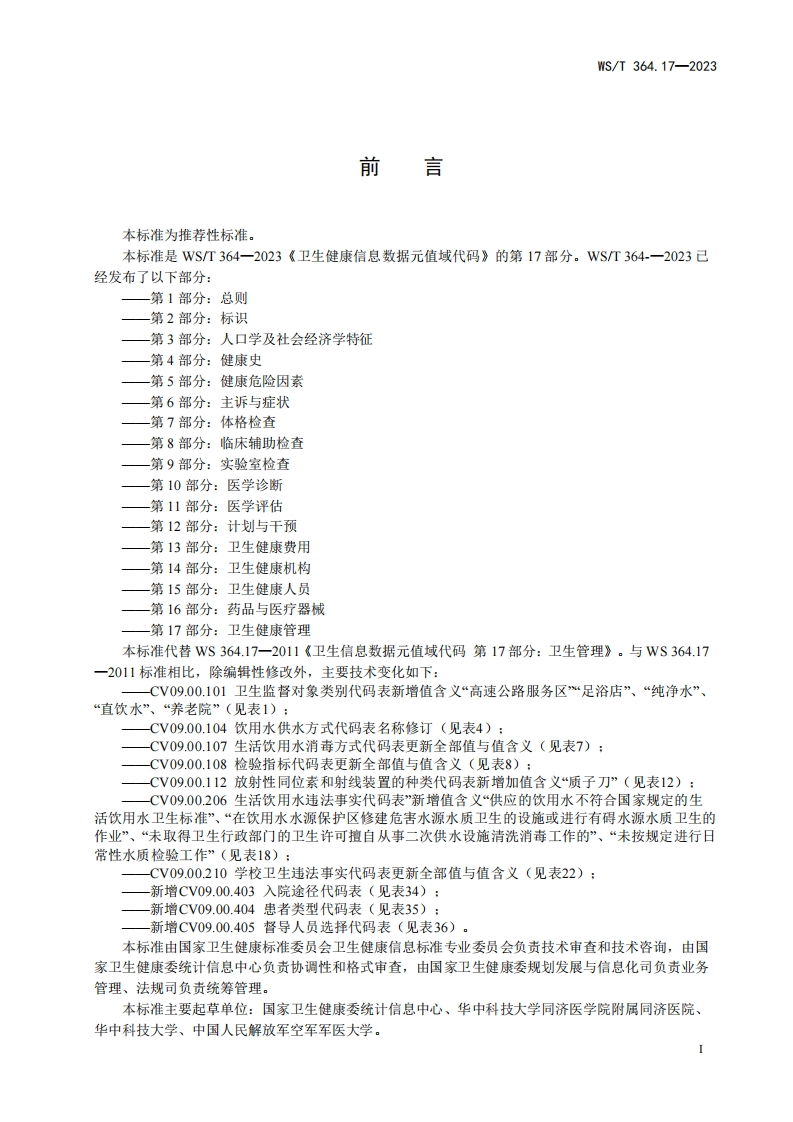 卫生健康信息数据元值域代码第17部分_卫生健康管理CodingforvaluedomainofhealthdataelementPart17_Healthmanagement348072@abc7天前发布关注私信0.29MB27页048卫生健康信息数据元值域代码第17部分_卫生健康管理CodingforvaluedomainofhealthdataelementPart17_Healthmanagement此内容为付费资源,请付费后查看¥13¥19黄金会员免费钻石会员免费立即购买您当前未登录!建议登陆后购买,可保存购买订单付费资源 第1页 / 共27页 第2页 / 共27页 第3页 / 共27页 第4页 / 共27页 第5页 / 共27页 试读已结束,还剩22页,您可下载完整版后进行离线阅读 THE END标准规范 文本预览 ICS11.020CCS C07WS中华人民共和国卫生行业标准WS/T364.17-2023代替WS364.17-2011卫生健康信息数据元值域代码第17部分:卫生健康管理Coding for value domain of health data element-Part 17:Health management2023-10-07发布2024-04-01实施中华人民共和国国家卫生健康委员会发布 查看更多 收起部分 喜欢就支持一下吧收藏