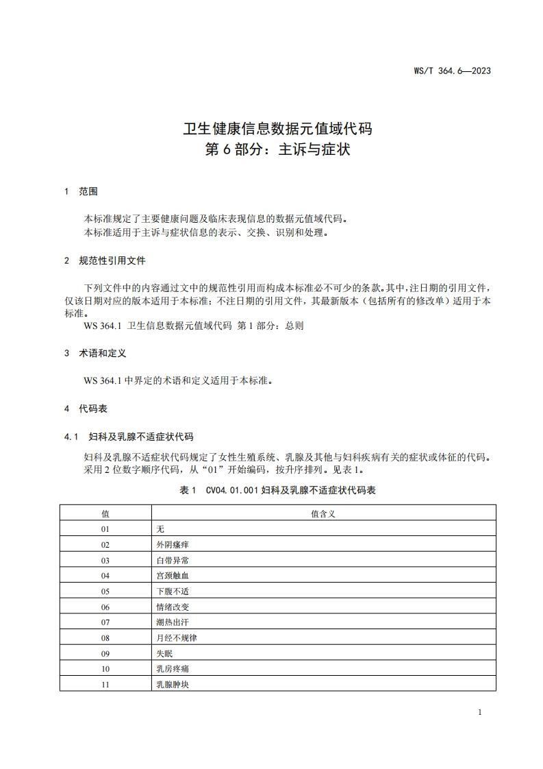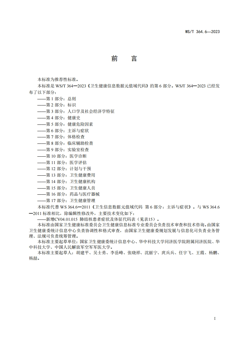 ICS11.020CCS C 07WS中华人民共和国卫生行业标准WS/T364.6-2023代替Ws364.6-2011卫生健康信息数据元值域代码第6部分:主诉与症状Coding standard for value domain of health data element-Part 6:Chief complaint and symptoms2023-10-07发布2024-04-01实施中华人民共和国国家卫生健康委员会发布
