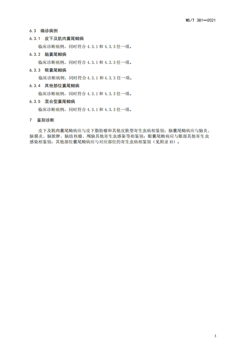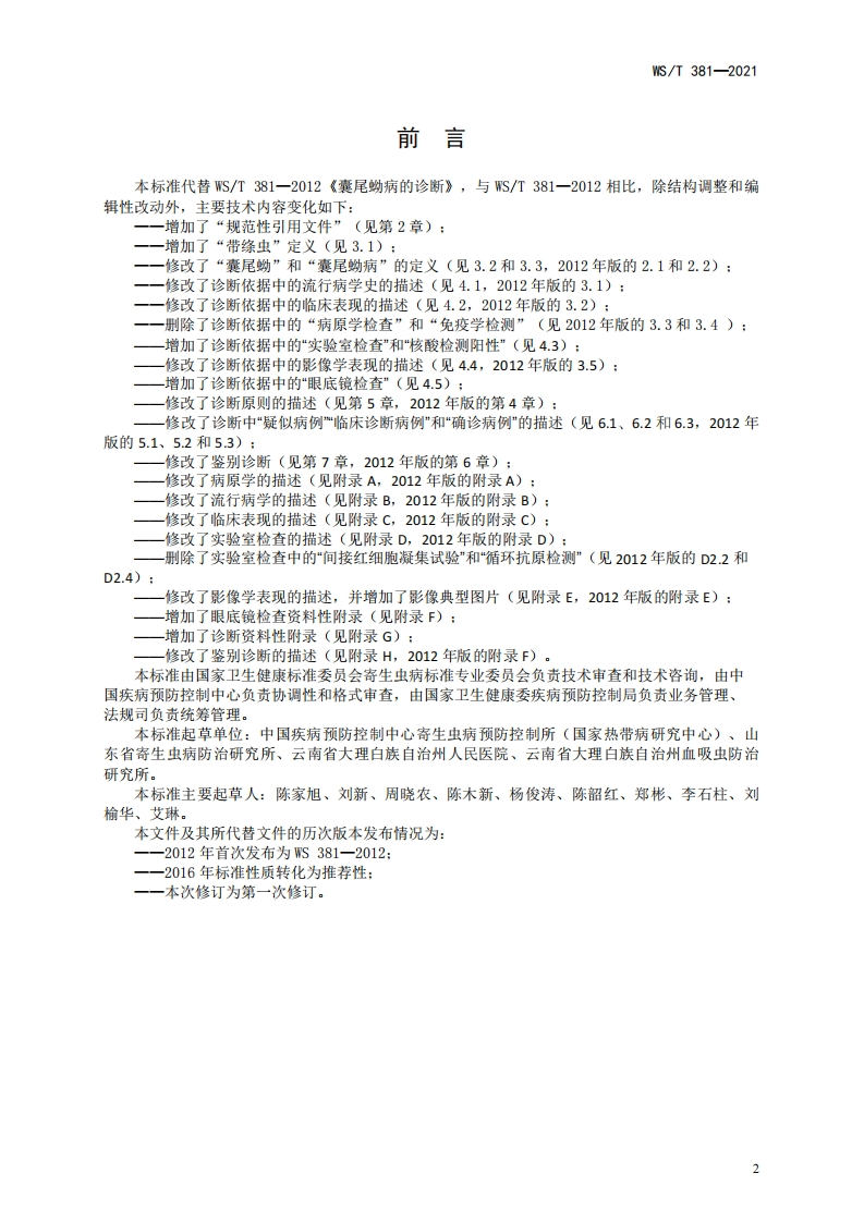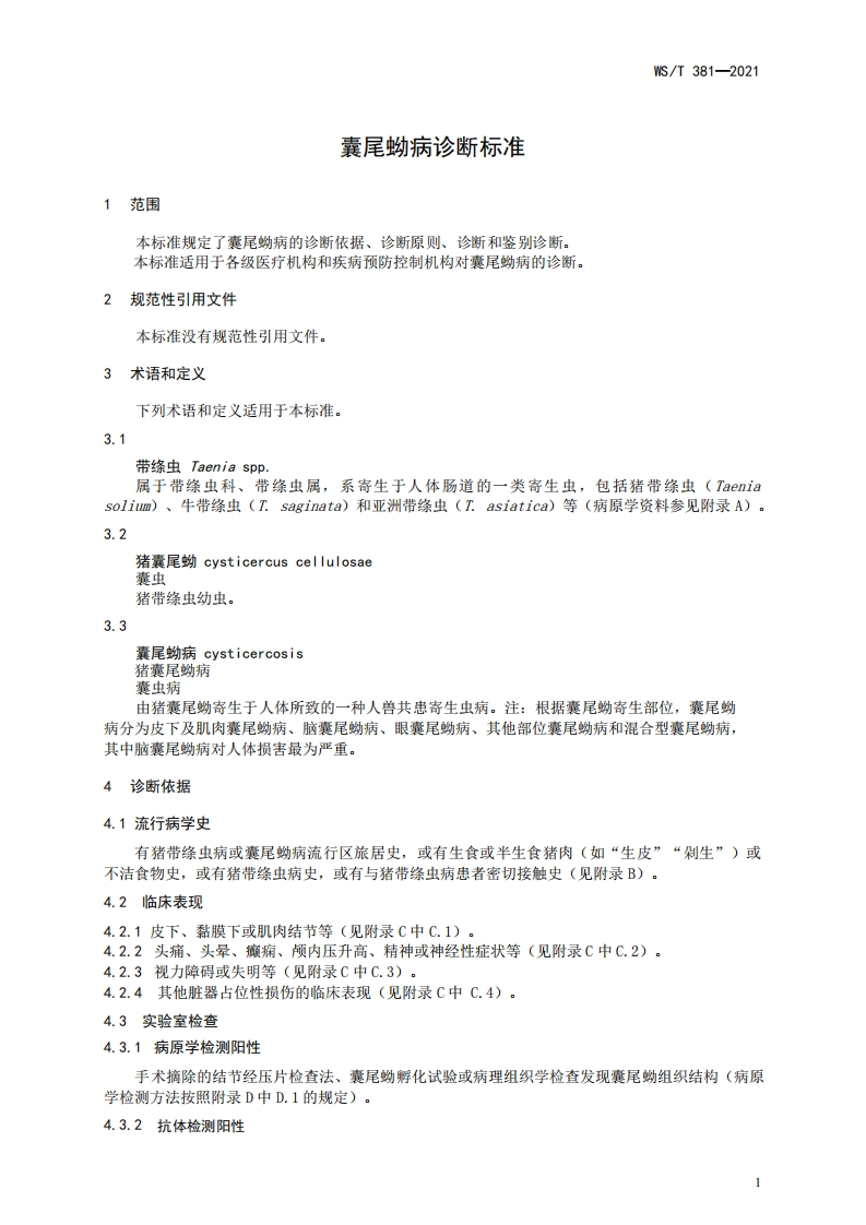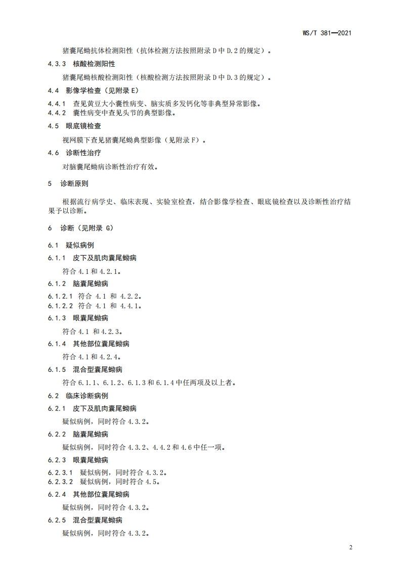 囊尾蚴病诊断标准Diagnosisstandardofcysticercosis348072@abc8天前发布关注私信0.70MB23页043囊尾蚴病诊断标准Diagnosisstandardofcysticercosis此内容为付费资源,请付费后查看¥13¥19黄金会员免费钻石会员免费立即购买您当前未登录!建议登陆后购买,可保存购买订单付费资源 第1页 / 共23页 第2页 / 共23页 第3页 / 共23页 第4页 / 共23页 第5页 / 共23页 试读已结束,还剩18页,您可下载完整版后进行离线阅读 THE END标准规范 文本预览 1CS11.020CCS C 61WS中华人民共和国卫生行业标准WS/T381-2021替代WS/T381-2012囊尾蚴病诊断标准Diagnosis standard of cysticercosis2021一11一23发布2022—05—01实施中华人民共和国国家卫生健康委员会发布 查看更多 收起部分 喜欢就支持一下吧收藏