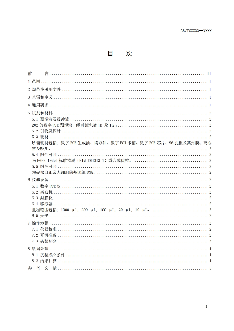 1Cs11.100.10CCS C 30GB中华人民共和国国家标准GB/TXXXXX-XXXX基于数字PCR的表皮生长因子受体(EGFR)基因突变丰度参考测量程序第3部分:外显子20点突变T790MReference measurement procedure for EGFR mutation fraction abundance bydigital PCR-Part 3:Exon 20 single nucleotide variant T790M(草案)XXXX-XX-Xx发布XXXX-XX-XX实施国家市场监督管理总局发布国家标准化管理委员会