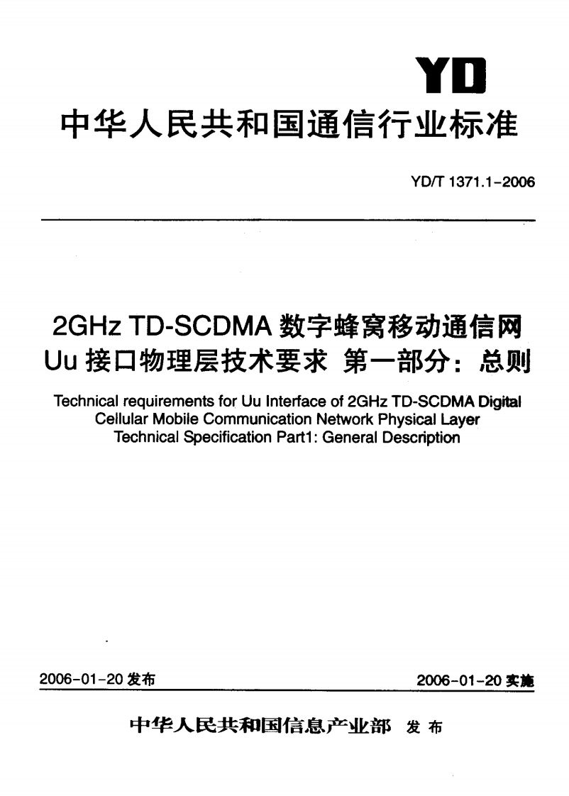 YD中华人民共和国通信行业标准YD/T1371.1-2006≈YD/T1371.6-20062 GHz TD-SCDMA数字蜂窝移动通信网Uu接口物理层技术要求Technical requirements for Uu Interface of 2GHz TD-SCDMA DigitalCellular Mobile Communication Network Physical Layer Technical2006-01-20发布2006-01-20实施中华人民共和国信息产业部发布