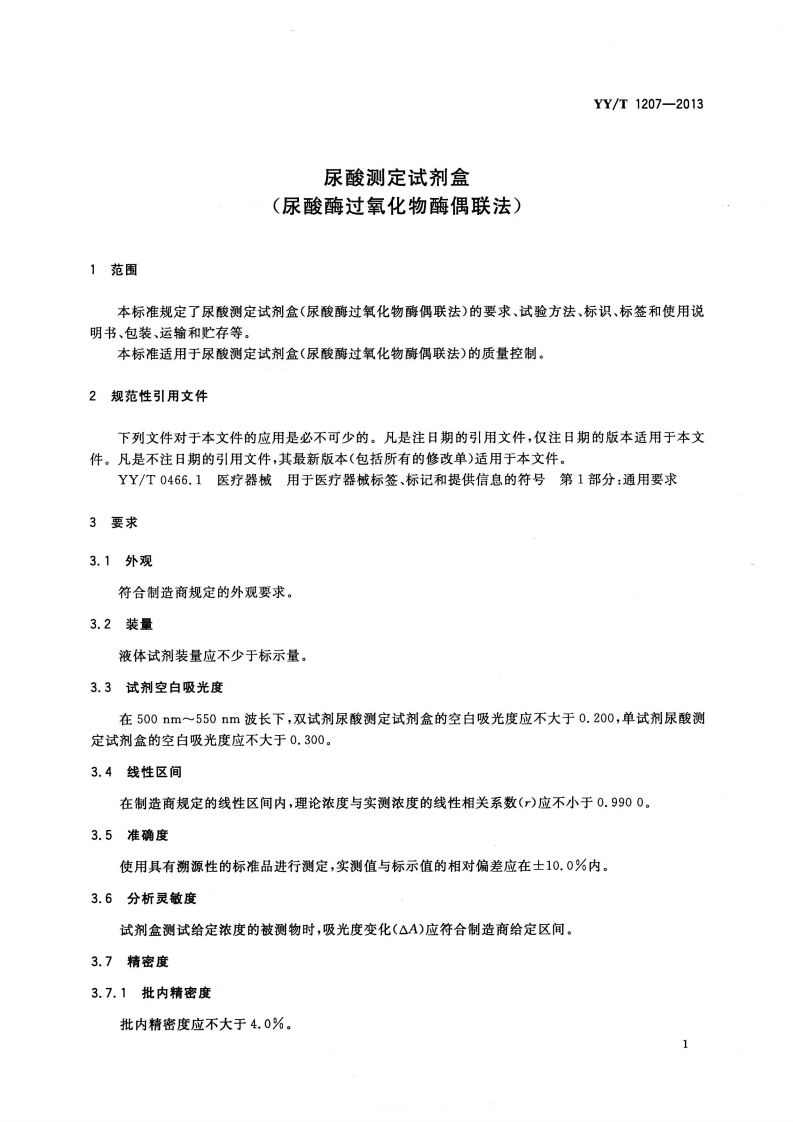 尿酸检测试剂盒(尿酸氧化酶-过氧化物酶偶联法)348072@abc9天前发布关注私信2.12MB12页049尿酸检测试剂盒(尿酸氧化酶-过氧化物酶偶联法)此内容为付费资源,请付费后查看¥13¥19黄金会员免费钻石会员免费立即购买您当前未登录!建议登陆后购买,可保存购买订单付费资源 第1页 / 共12页 第2页 / 共12页 第3页 / 共12页 第4页 / 共12页 第5页 / 共12页 试读已结束,还剩7页,您可下载完整版后进行离线阅读 THE END标准规范 文本预览 ICS11.100C44YY中华人民共和国医药行业标准YY/T1207-2013尿酸测定试剂盒(尿酸酶过氧化物酶偶联法)Uric acid assay kit (Uricase-PAP method)2013-10-21发布2014-10-01实施国家食品药品监督管理总局发布Φ 查看更多 收起部分 喜欢就支持一下吧收藏