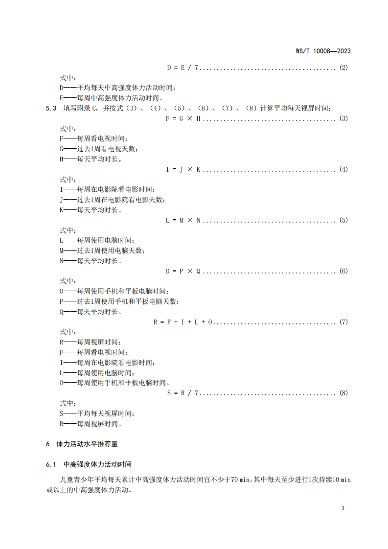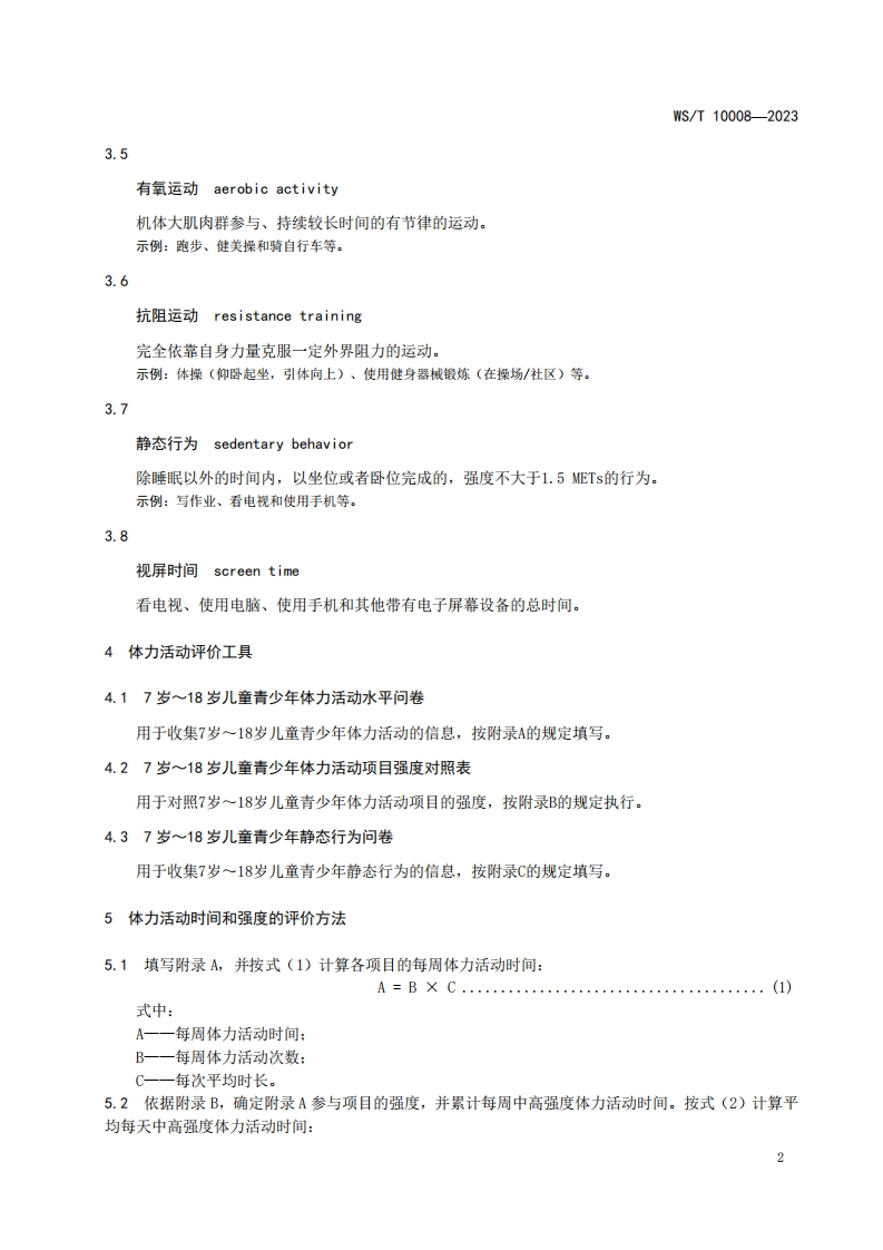 岁~18岁儿童青少年体力活动水亚评价Physicalactivitylevelevaluationforchildrenandadolescentsaged7~18years348072@abc9天前发布关注私信0.49MB10页046岁~18岁儿童青少年体力活动水亚评价Physicalactivitylevelevaluationforchildrenandadolescentsaged7~18years此内容为付费资源,请付费后查看¥13¥19黄金会员免费钻石会员免费立即购买您当前未登录!建议登陆后购买,可保存购买订单付费资源 第1页 / 共10页 第2页 / 共10页 第3页 / 共10页 第4页 / 共10页 第5页 / 共10页 试读已结束,还剩5页,您可下载完整版后进行离线阅读 THE END标准规范 文本预览 1CS13.100CCS C 56中华人民共和国卫生行业标准WS/T10008-20237岁~18岁儿童青少年体力活动水平评价Physical activity level evaluation for children and adolescents aged 718 years2023-12-15发布2024-05-01实施国家疾病预防控制局发布 查看更多 收起部分 喜欢就支持一下吧收藏