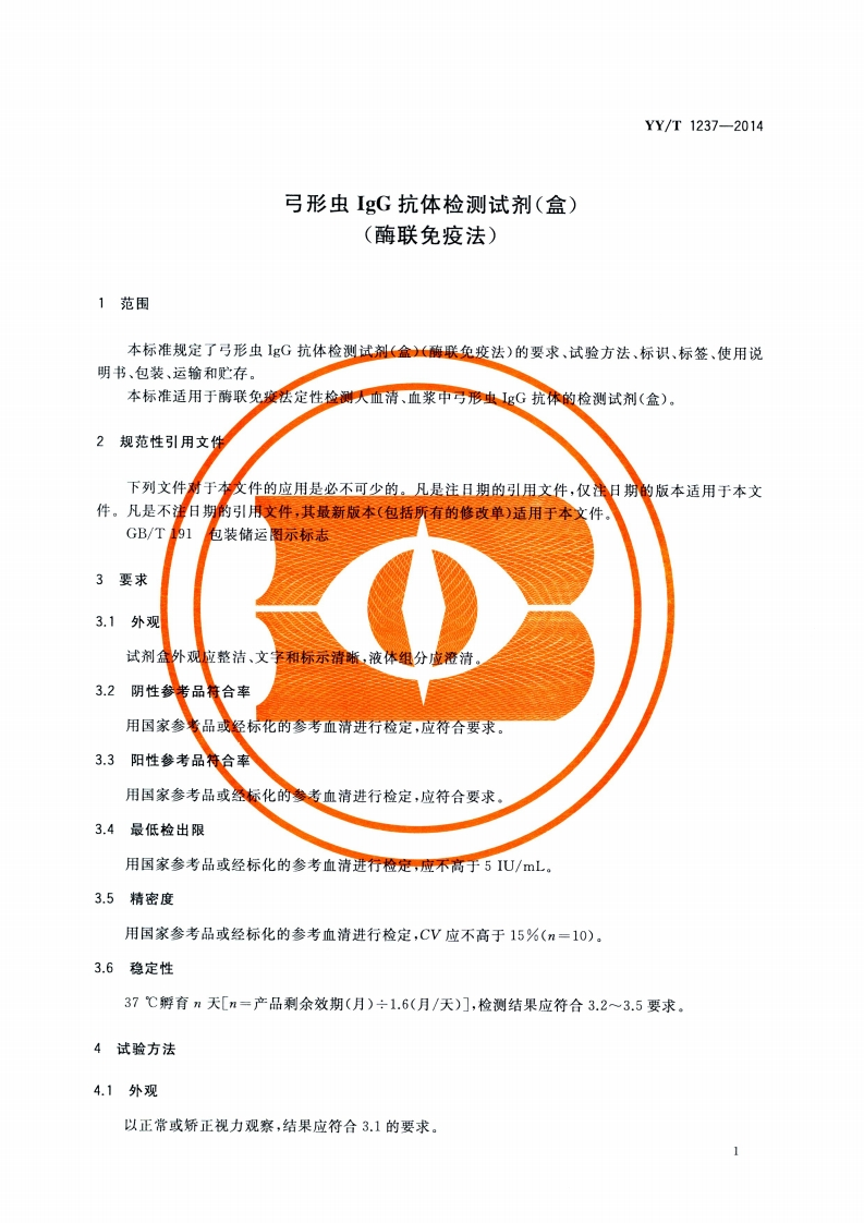 弓形虫免疫球蛋白G抗体检测试剂盒(酶联免疫法)DiagnostickitforIgGantibodyagainstToxoplasmagondii(ELISA)348072@abc10天前发布关注私信1.97MB8页036弓形虫免疫球蛋白G抗体检测试剂盒(酶联免疫法)DiagnostickitforIgGantibodyagainstToxoplasmagondii(ELISA)此内容为付费资源,请付费后查看¥13¥19黄金会员免费钻石会员免费立即购买您当前未登录!建议登陆后购买,可保存购买订单付费资源 第1页 / 共8页 第2页 / 共8页 第3页 / 共8页 第4页 / 共8页 第5页 / 共8页 试读已结束,还剩3页,您可下载完整版后进行离线阅读 THE END标准规范 文本预览 ICS11.100C44YY中华人民共和国医药行业标准YY/T1237-2014弓形虫IgG抗体检测试剂(盒)(酶联免疫法)Diagnostic kit for IgG antibody to toxophasma (ELISA)2014-06-17发布2015-07-01实施国家食品药品监督管理总局发布 查看更多 收起部分 喜欢就支持一下吧收藏