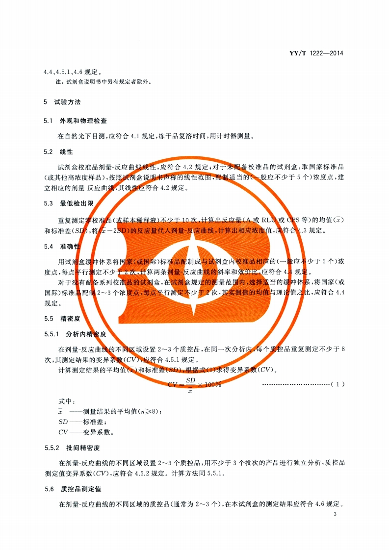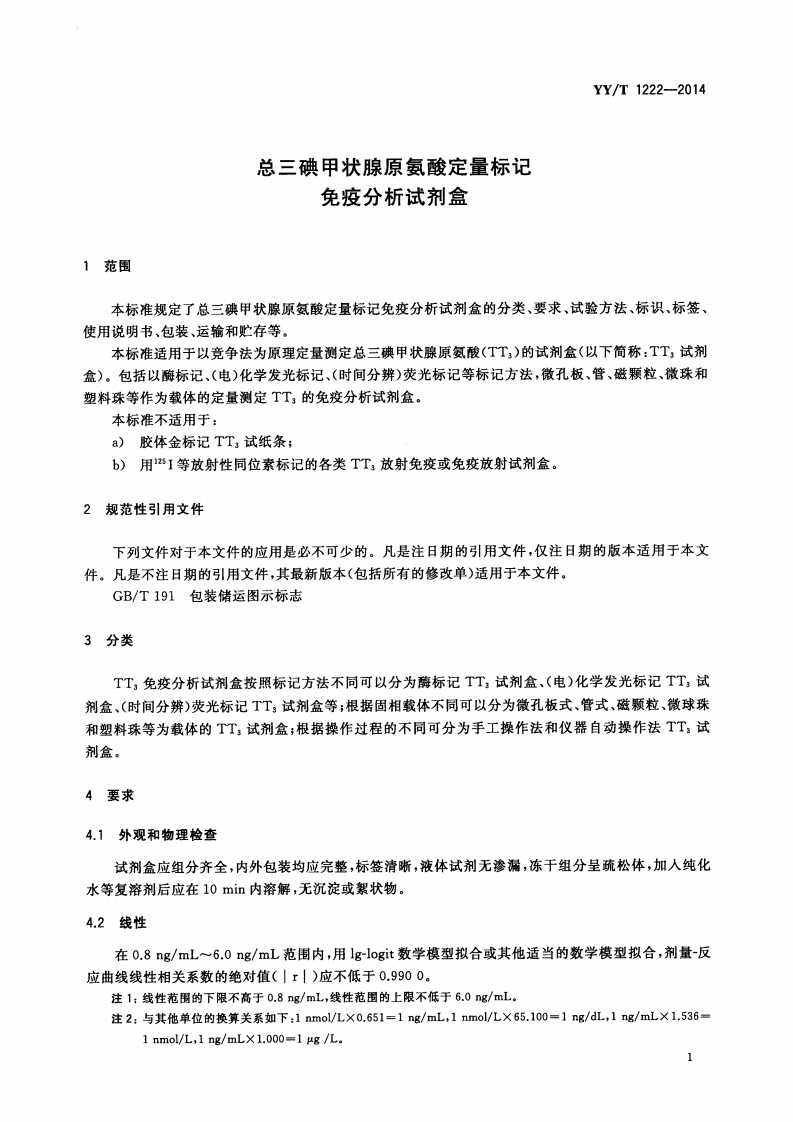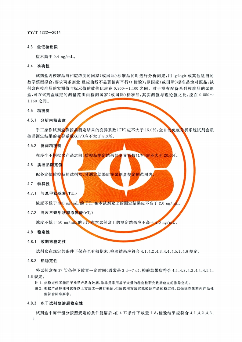 总三碘甲状腺原氨酸定量标记免疫分析试剂盒TotleT3quantitativelabellingimmunoassaykit348072@abc10天前发布关注私信2.78MB9页040总三碘甲状腺原氨酸定量标记免疫分析试剂盒TotleT3quantitativelabellingimmunoassaykit此内容为付费资源,请付费后查看¥13¥19黄金会员免费钻石会员免费立即购买您当前未登录!建议登陆后购买,可保存购买订单付费资源 第1页 / 共9页 第2页 / 共9页 第3页 / 共9页 第4页 / 共9页 第5页 / 共9页 试读已结束,还剩4页,您可下载完整版后进行离线阅读 THE END标准规范 文本预览 ICS11.100C44YY中华人民共和国医药行业标准YY/T1222-2014总三碘甲状腺原氨酸定量标记免疫分析试剂盒Totle T3 quantitative labelling immunoassay kit2014-06-17发布2015-07-01实施国家食品药品监督管理总局发布 查看更多 收起部分 喜欢就支持一下吧收藏