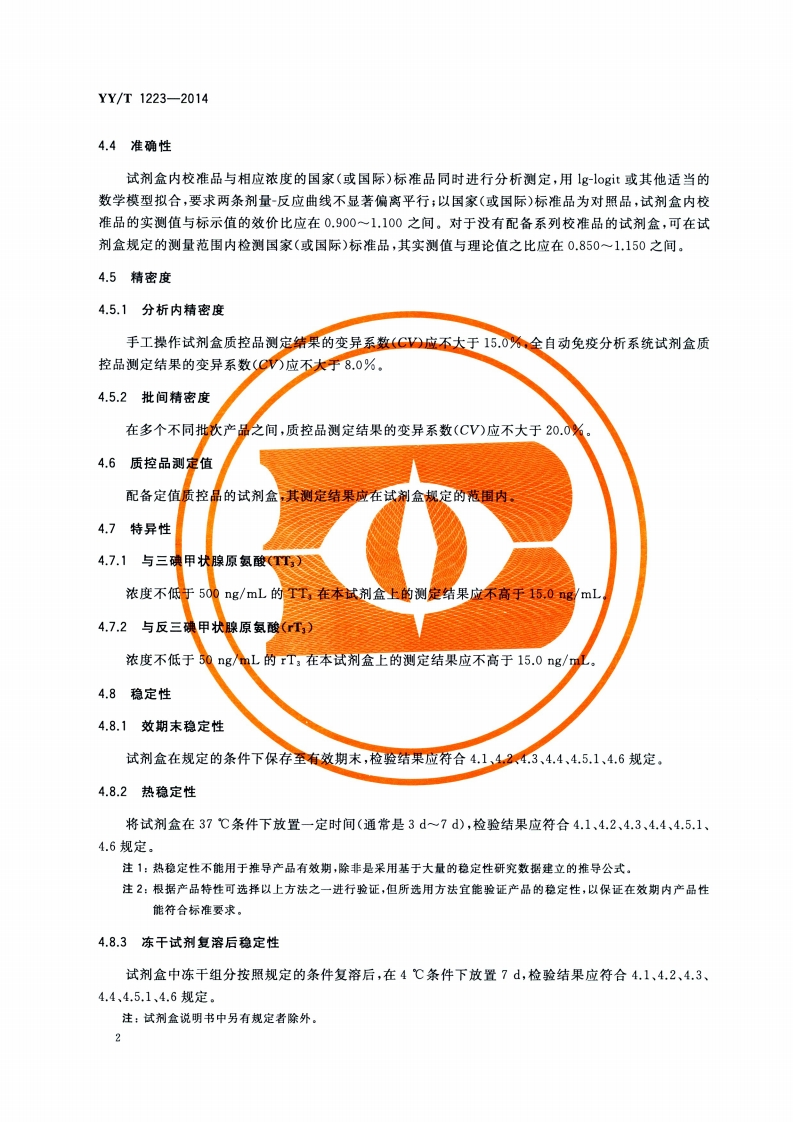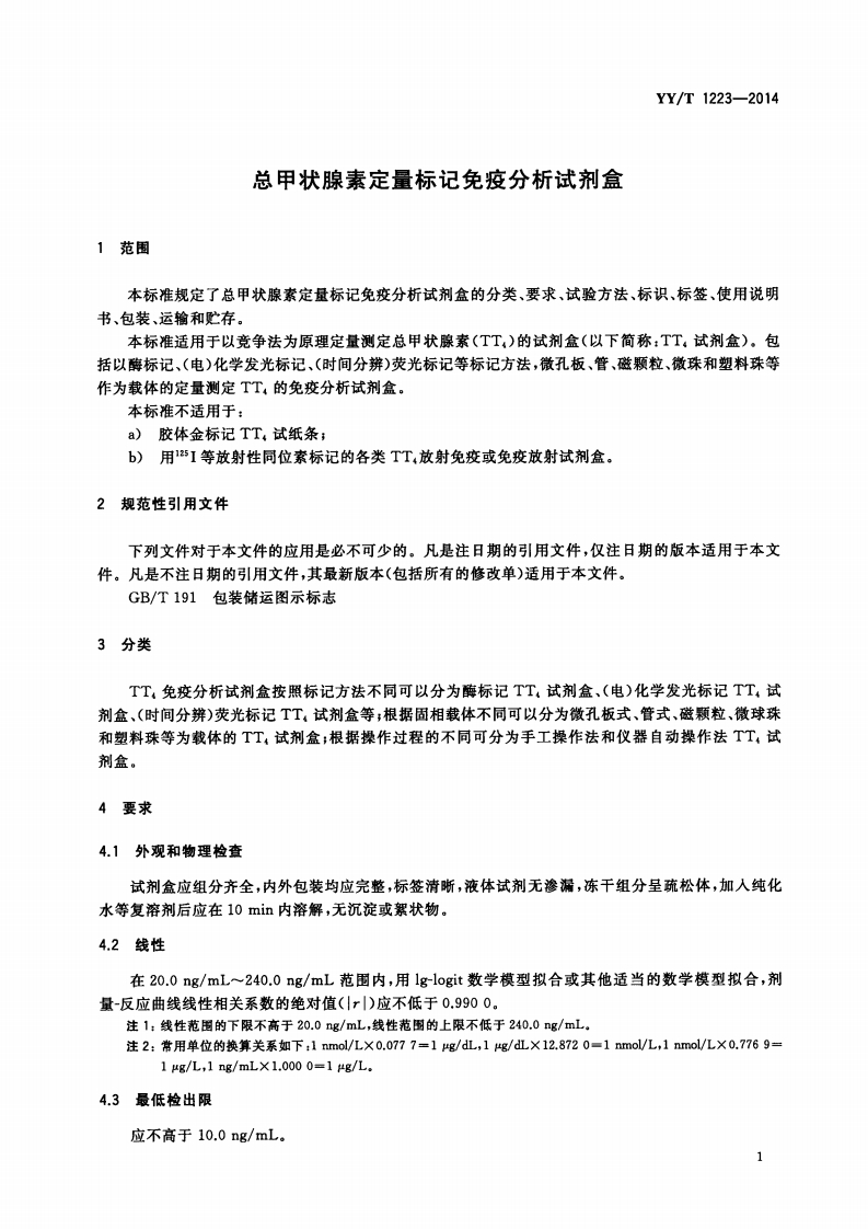 总甲状腺素定量标记免疫分析试剂盒TotleT4quantitativelabellingimmunoassaykit348072@abc10天前发布关注私信2.82MB9页027总甲状腺素定量标记免疫分析试剂盒TotleT4quantitativelabellingimmunoassaykit此内容为付费资源,请付费后查看¥13¥19黄金会员免费钻石会员免费立即购买您当前未登录!建议登陆后购买,可保存购买订单付费资源 第1页 / 共9页 第2页 / 共9页 第3页 / 共9页 第4页 / 共9页 第5页 / 共9页 试读已结束,还剩4页,您可下载完整版后进行离线阅读 THE END标准规范 文本预览 ICS11.100C44YY中华人民共和国医药行业标准YY/T1223-2014总甲状腺素定量标记免疫分析试剂盒Totle T4 quantitative labelling immunoassay kit2014-06-17发布2015-07-01实施Φ@国家食品药品监督管理总局发布 查看更多 收起部分 喜欢就支持一下吧收藏