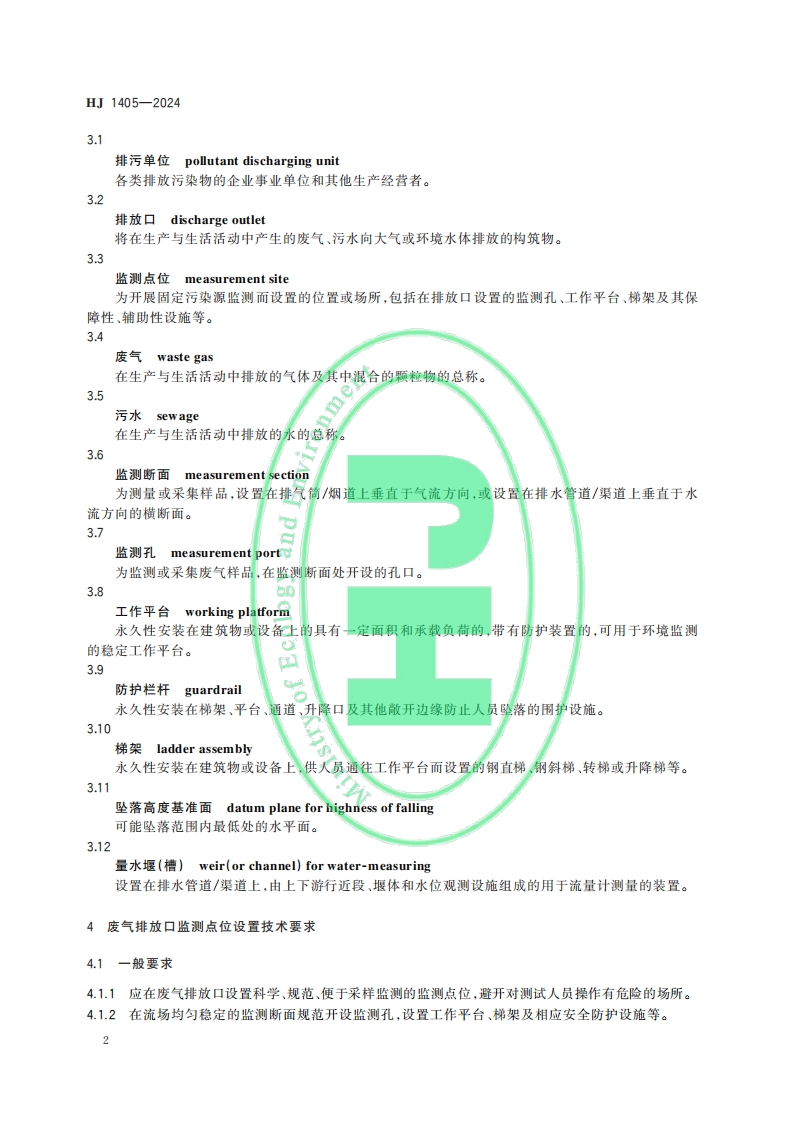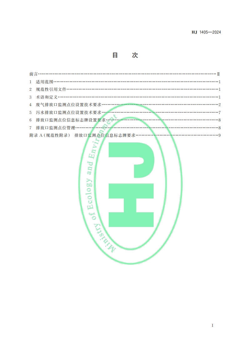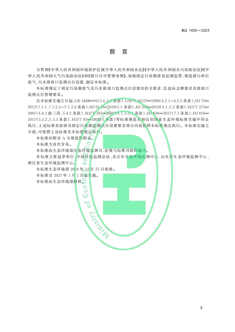 HJ中华人民共和国国家生态环境标准HJ1405一2024oment排污单位污染物排放口监测点位设置技术规范Technical specification for measurement site setting of pollutant dischargeoutlet of pollutant discharge unit本电子版为正式标准文本,由生态环境部环境标准研究所审校排版。国Jo Knsyutw2024-12-25发布2027-01-01实施生态环境部发布
