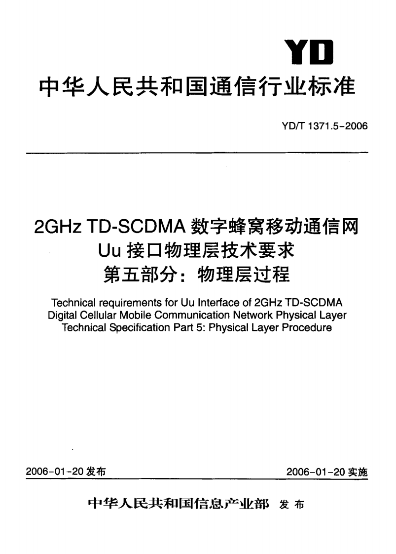 YD中华人民共和国通信行业标准YD/T1371.1-2006-YD/T1371.6-20062 GHz TD-SCDMA数字蜂窝移动通信网Uu接口物理层技术要求Technical requirements for Uu Interface of 2GHz TD-SCDMA DigitalCellular Mobile Communication Network Physical Layer Technical2006-01-20发布2006-01-20实施中华人民共和国信息产业部发布