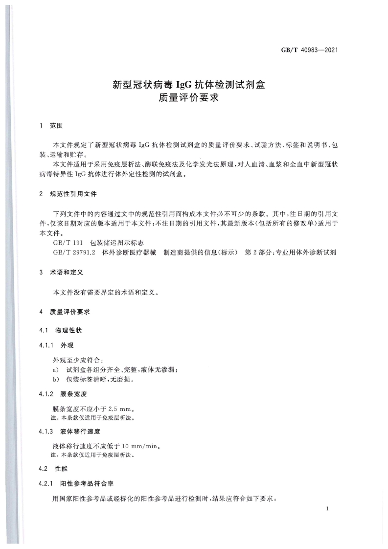 1CS11.100.10CCS C 44中华人民共和国国家标准GB/T40983-2021新型冠状病毒IgG抗体检测试剂盒质量评价要求Quality assessment requirements for severe acute respiratory syndromecoronavirus 2 (SARS-CoV-2)IgG antibody detection kit2021-11-26发布2022-03-01实施国家市场监督管理总局国家标准化管理委员会发布Φ利学易查真仿