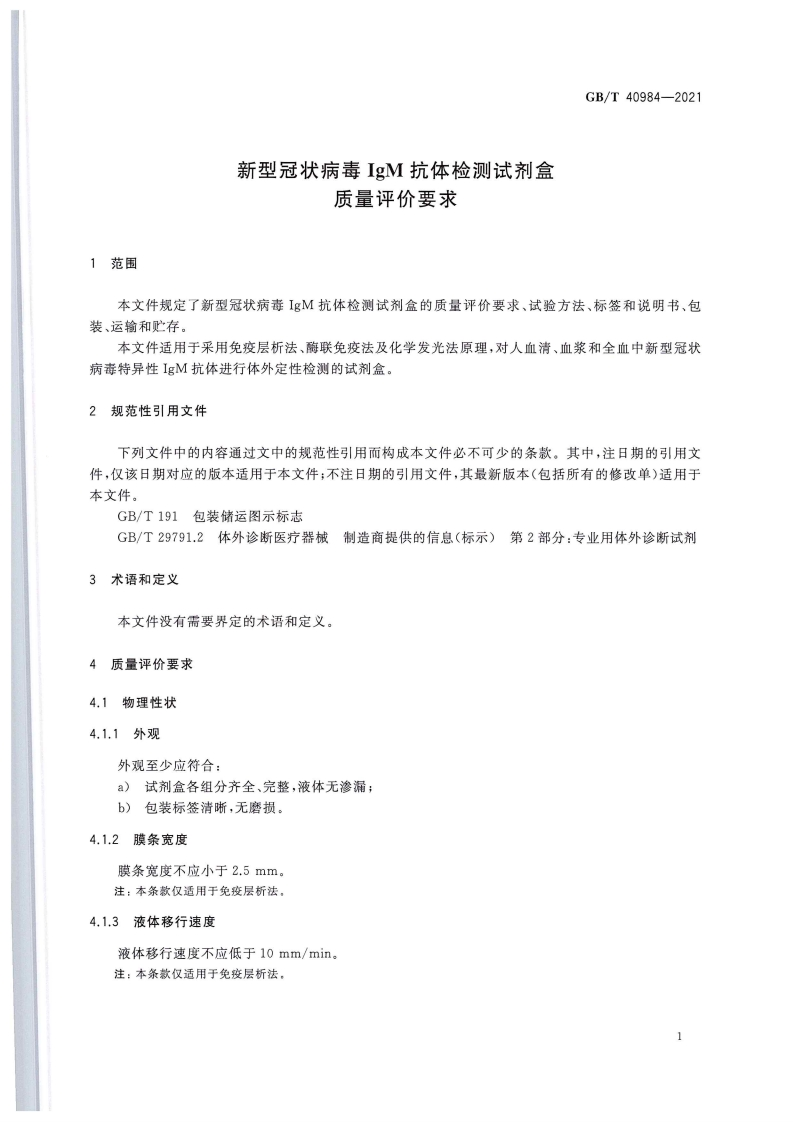 ICS11.100.10CCS C 44GB中华人民共和国国家标准GB/T40984-2021新型冠状病毒IgM抗体检测试剂盒质量评价要求Quality assessment requirements for severe acute respiratory syndromecoronavirus 2(SARS-CoV-2)IgM antibody detection kit2021-11-26发布2022-03-01实施国家市场监督管理总局国家标准化管理委员会发布利条查真约
