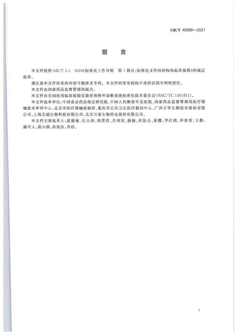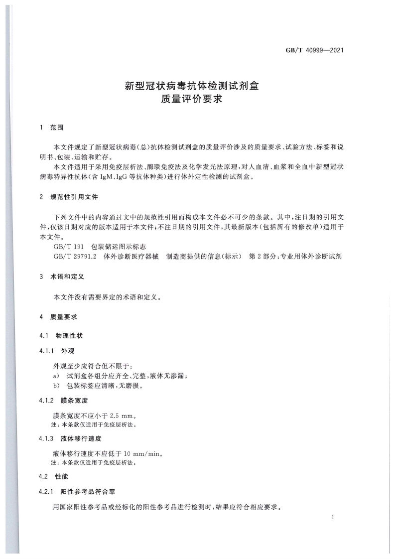 ICS11.100.10CCS C 44中华人民共和国国家标准GB/T40999-2021新型冠状病毒抗体检测试剂盒质量评价要求Quality assessment requirements for Severe Acute Respiratory SyndromeCoronavirus 2(SARS-CoV-2)total antibody detection kit2021-11-26发布2022-03-01实施国家市场监督管理总局国家标准化管理委员会发布除墨直真