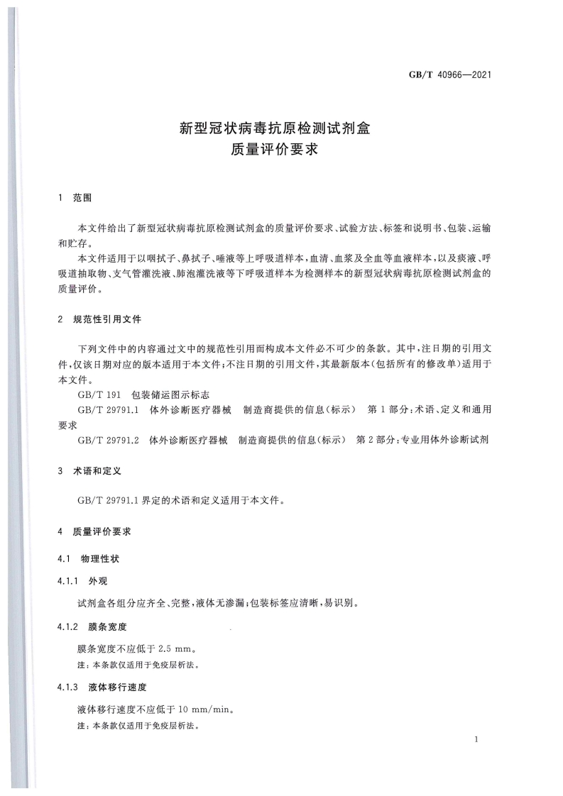 ICS11.100.10CCS C 44中华人民共和国国家标准GB/T40966一2021新型冠状病毒抗原检测试剂盒质量评价要求Quality assessment requirements for severe acute respiratory syndrome coronavirus 2(SARS-CoV-2)antigen detection kit2021-11-26发布2022-03-01实施国家市场监督管理总局国家标准化管理委员会发布