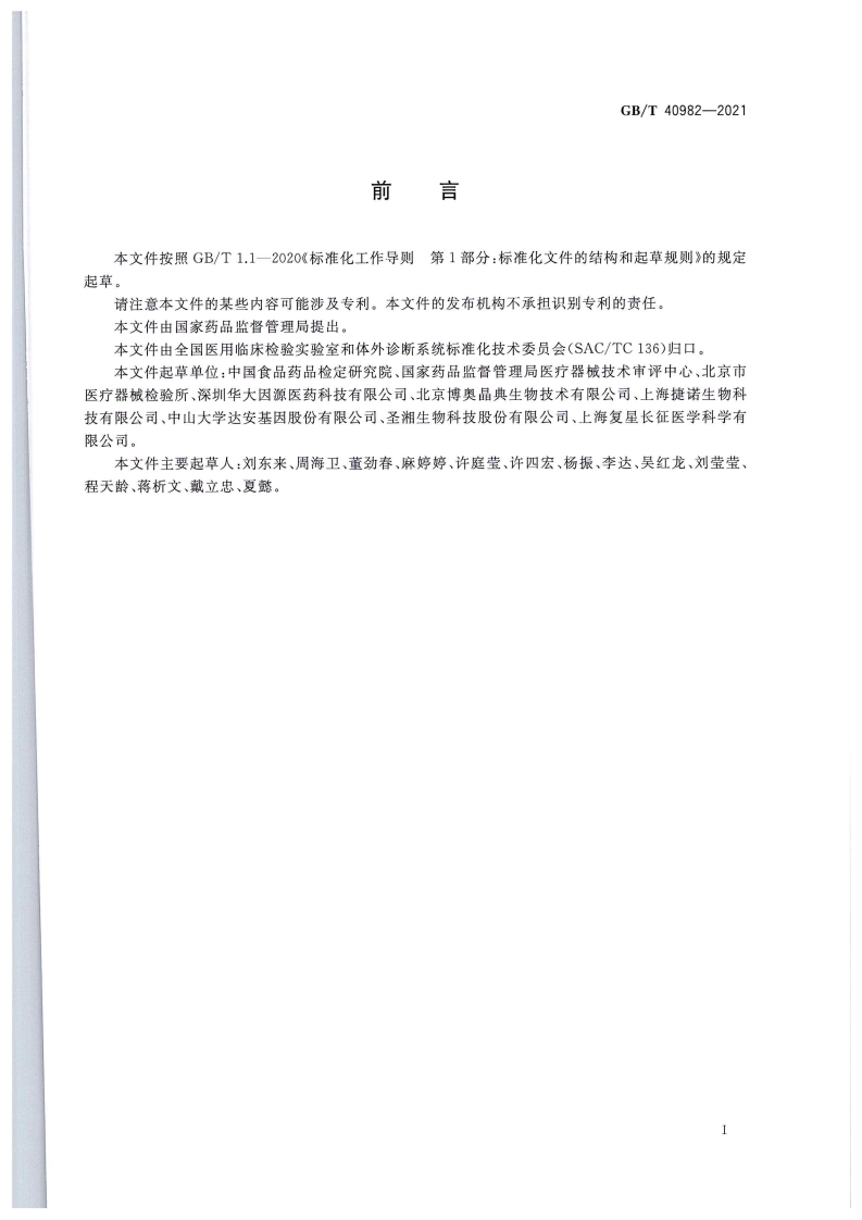 1Cs11.100.10CCS C 44GB中华人民共和国国家标准GB/T40982一2021新型冠状病毒核酸检测试剂盒质量评价要求Quality assessment requirements for severe acute respiratory syndrome coronavirus 2(SARS-CoV-2)nucleic acid detection kit2021-11-26发布2022-03-01实施国家市场监督管理总局国家标准化管理委员会发布利洛查真