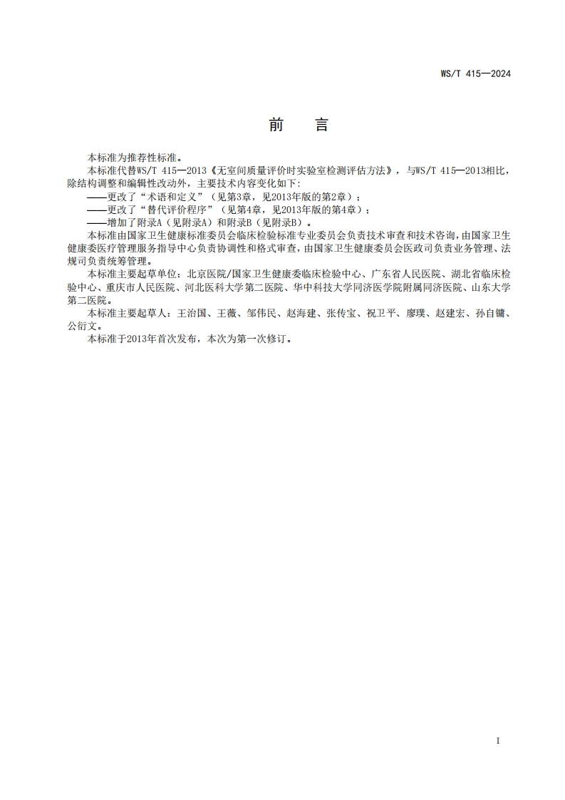 ICS11.020CCS C 50WS中华人民共和国卫生行业标准WS/T415-2024代替WS/T415一2013无室间质量评价时的临床检验质量评价Quality assessment for clinical laboratory testing when external quality assessment isnot available2024-05-09发布2024-11-01实施中华人民共和国国家卫生健康委员会发布