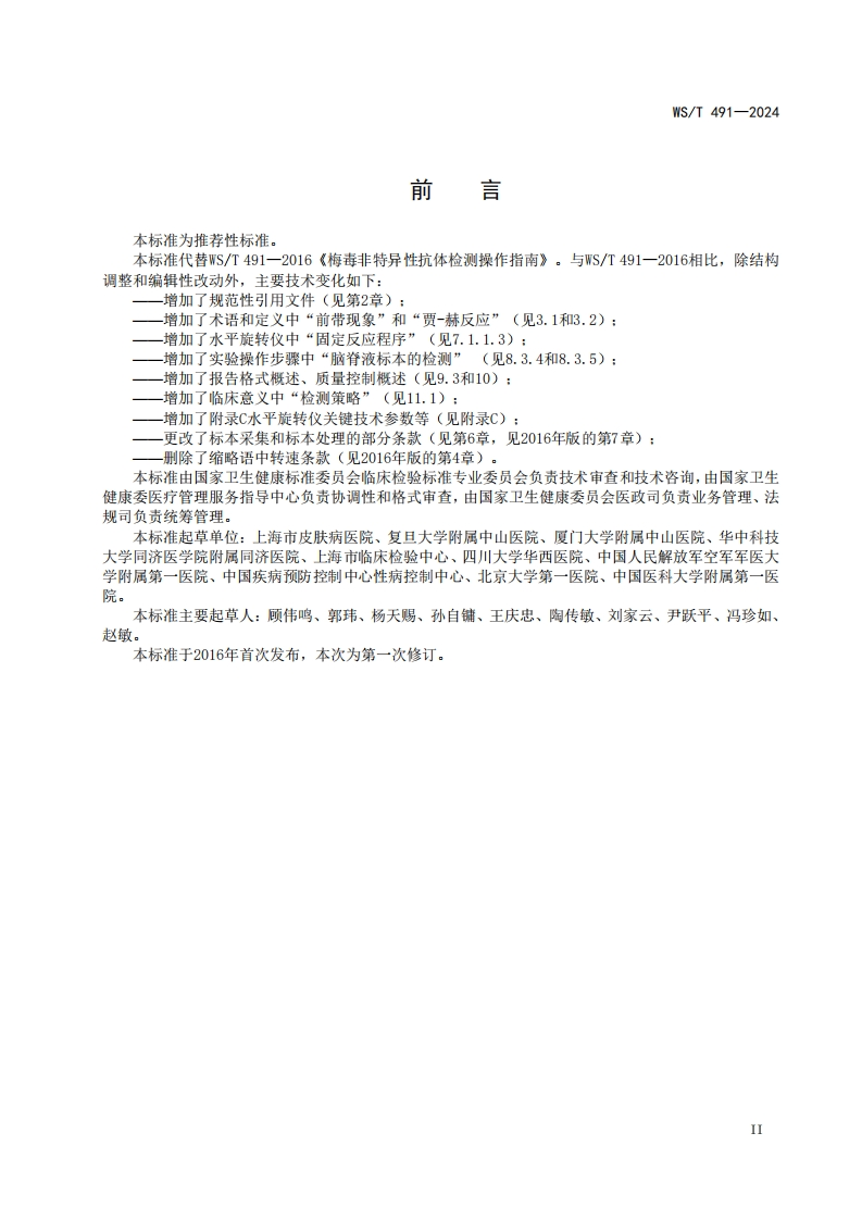 梅毒非特异性抗体检测指南Guidelineofnon-treponemaltestsforsyphilis348072@abc9天前发布关注私信0.43MB20页044梅毒非特异性抗体检测指南Guidelineofnon-treponemaltestsforsyphilis此内容为付费资源,请付费后查看¥13¥19黄金会员免费钻石会员免费立即购买您当前未登录!建议登陆后购买,可保存购买订单付费资源 第1页 / 共20页 第2页 / 共20页 第3页 / 共20页 第4页 / 共20页 第5页 / 共20页 试读已结束,还剩15页,您可下载完整版后进行离线阅读 THE END标准规范 文本预览 ICS11.020CCS C 50WS中华人民共和国卫生行业标准WS/T491-2024代替WS/T491一2016梅毒非特异性抗体检测指南Guideline of non-treponemal tests for syphilis2024-05-09发布2024-11-01实施中华人民共和国国家卫生健康委员会发布 查看更多 收起部分 喜欢就支持一下吧收藏