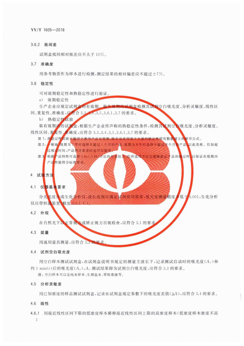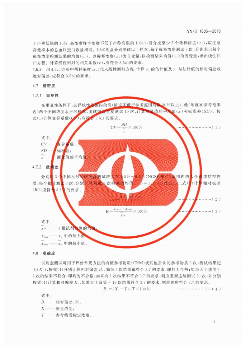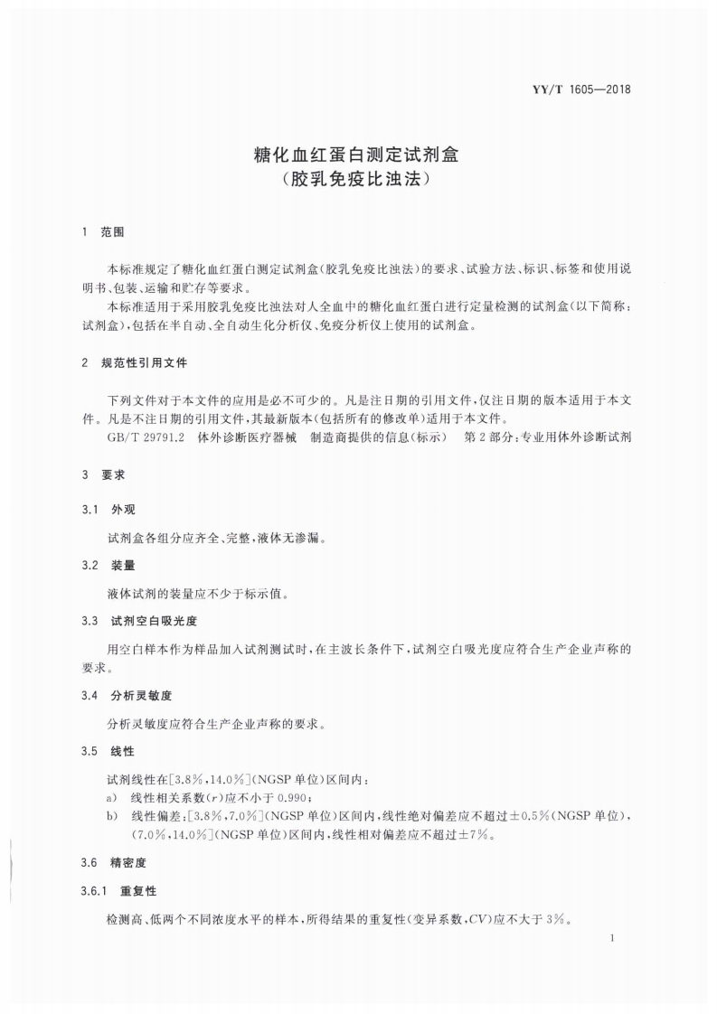 糖化血红蛋白检测试剂盒(胶乳免疫比浊法)HbA1c检测试剂盒(胶乳免疫比浊法)348072@abc6天前发布关注私信1.08MB8页039糖化血红蛋白检测试剂盒(胶乳免疫比浊法)HbA1c检测试剂盒(胶乳免疫比浊法)此内容为付费资源,请付费后查看¥13¥19黄金会员免费钻石会员免费立即购买您当前未登录!建议登陆后购买,可保存购买订单付费资源 第1页 / 共8页 第2页 / 共8页 第3页 / 共8页 第4页 / 共8页 第5页 / 共8页 试读已结束,还剩3页,您可下载完整版后进行离线阅读 THE END标准规范 文本预览 1CS11.100C44YY142中华人民共和国医药行业标准YY/T1605-2018糖化血红蛋白测定试剂盒(胶乳免疫比浊法)Hemoglobin Alc testing kit(latex immunoturbidimetric method)2018-02-24发布2019-03-01实施国家食品药品监督管理总局发布Φ 查看更多 收起部分 喜欢就支持一下吧收藏