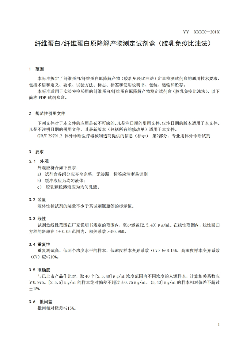 纤维蛋白与纤维蛋白原降解产物检测试剂盒(胶乳免疫比浊法)Fibrin-FibrinogenDegradationProductsDetectionKit348072@abc6天前发布关注私信0.41MB10页023纤维蛋白与纤维蛋白原降解产物检测试剂盒(胶乳免疫比浊法)Fibrin-FibrinogenDegradationProductsDetectionKit此内容为付费资源,请付费后查看¥13¥19黄金会员免费钻石会员免费立即购买您当前未登录!建议登陆后购买,可保存购买订单付费资源 第1页 / 共10页 第2页 / 共10页 第3页 / 共10页 第4页 / 共10页 第5页 / 共10页 试读已结束,还剩5页,您可下载完整版后进行离线阅读 THE END标准规范 文本预览 1CS11.100C44YY中华人民共和国医药行业标准YY XXXX-201X纤维蛋白/纤维蛋白原降解产物测定试剂盒(胶乳免疫比浊法)Fibrin/Fibrinogen Degradation Products Assay (Kit)××X×-××-××发布××××-××-××实施国家食品药品监督管理总局发布 查看更多 收起部分 喜欢就支持一下吧收藏