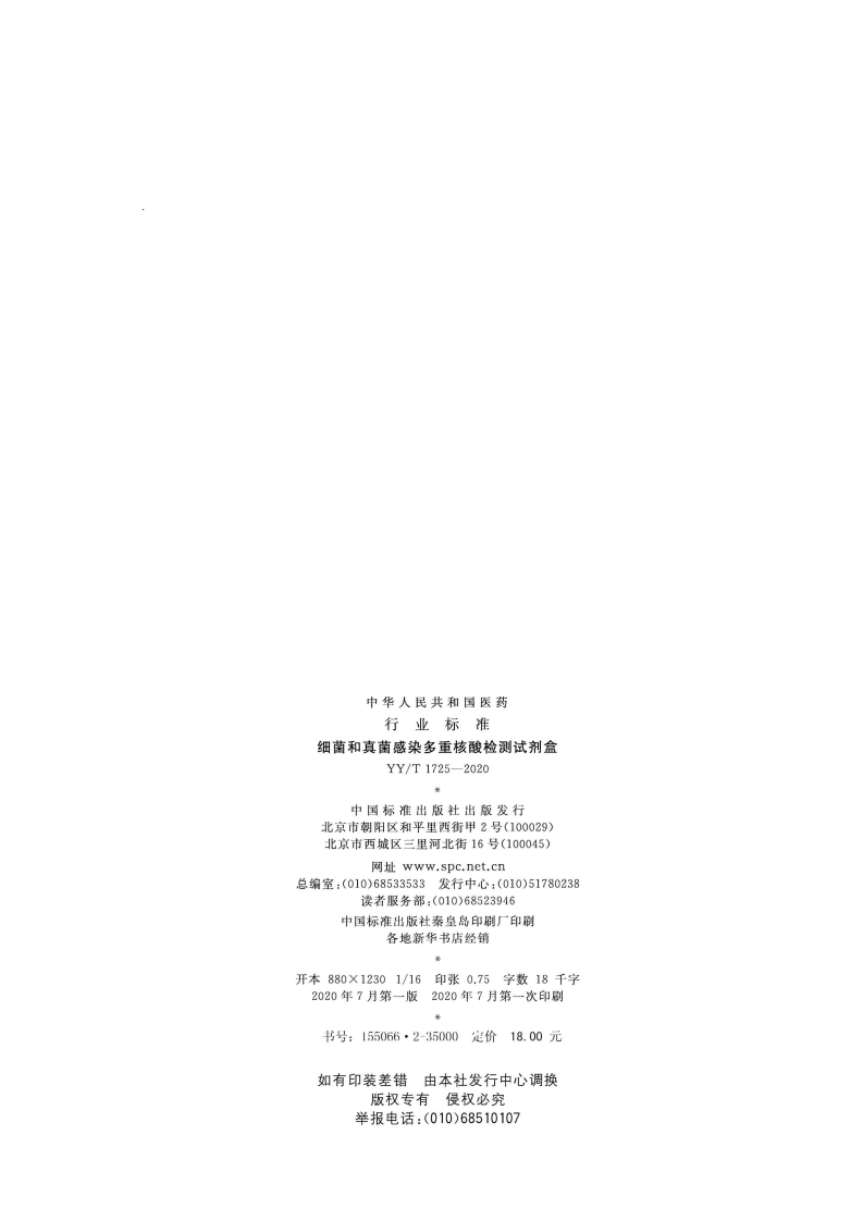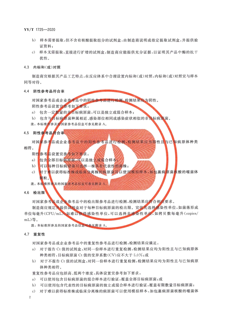 细菌和真菌感染多重核酸检测试剂盒Multiplexnucleicaciddetectionkitforinfectionofmicroorganisms348072@abc5天前发布关注私信3.59MB11页034细菌和真菌感染多重核酸检测试剂盒Multiplexnucleicaciddetectionkitforinfectionofmicroorganisms此内容为付费资源,请付费后查看¥13¥19黄金会员免费钻石会员免费立即购买您当前未登录!建议登陆后购买,可保存购买订单付费资源 第1页 / 共11页 第2页 / 共11页 第3页 / 共11页 第4页 / 共11页 第5页 / 共11页 试读已结束,还剩6页,您可下载完整版后进行离线阅读 THE END标准规范 文本预览 1CS11.040.30C30YY中华人民共和国医药行业标准YY/T1725-2020细菌和真菌感染多重核酸检测试剂盒Multiplex nucleic acid detection kit for infection of microorganisms2020-06-30发布2021-12-01实施国家药品监督管理局发布 查看更多 收起部分 喜欢就支持一下吧收藏