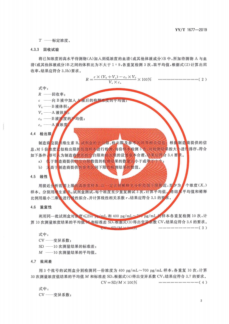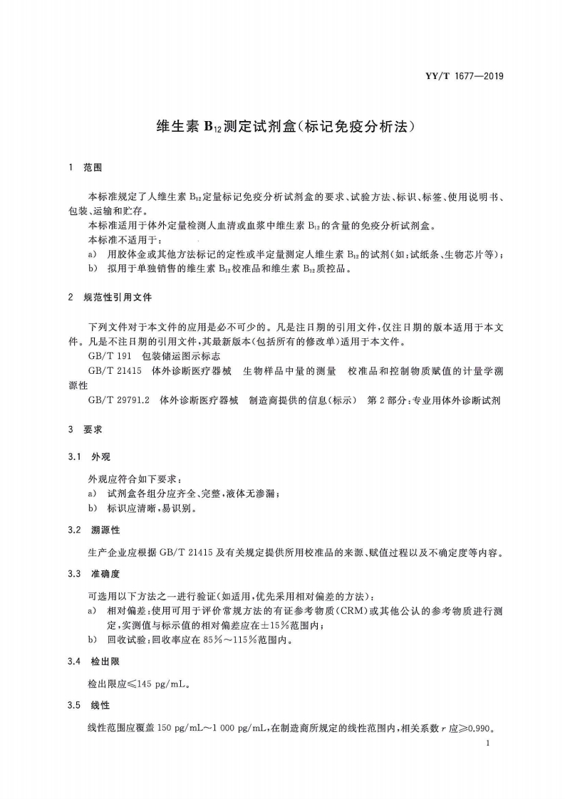 维生素B1z测定试剂盒(标记免疫分析法)VitaminBtestingkit(labellingimmunoassay)348072@abc5天前发布关注私信1.34MB8页046维生素B1z测定试剂盒(标记免疫分析法)VitaminBtestingkit(labellingimmunoassay)此内容为付费资源,请付费后查看¥13¥19黄金会员免费钻石会员免费立即购买您当前未登录!建议登陆后购买,可保存购买订单付费资源 第1页 / 共8页 第2页 / 共8页 第3页 / 共8页 第4页 / 共8页 第5页 / 共8页 试读已结束,还剩3页,您可下载完整版后进行离线阅读 THE END标准规范 文本预览 1Cs11.100C447加YY中华人民共和国医药行业标准YY/T1677-2019维生素B12测定试剂盒(标记免疫分析法)Vitamin B12 testing kit(labelling immunoassay)2019-10-23发布2020-10-01实施国家药品监督管理局发布 查看更多 收起部分 喜欢就支持一下吧收藏