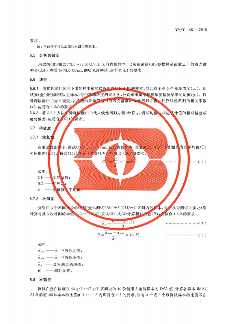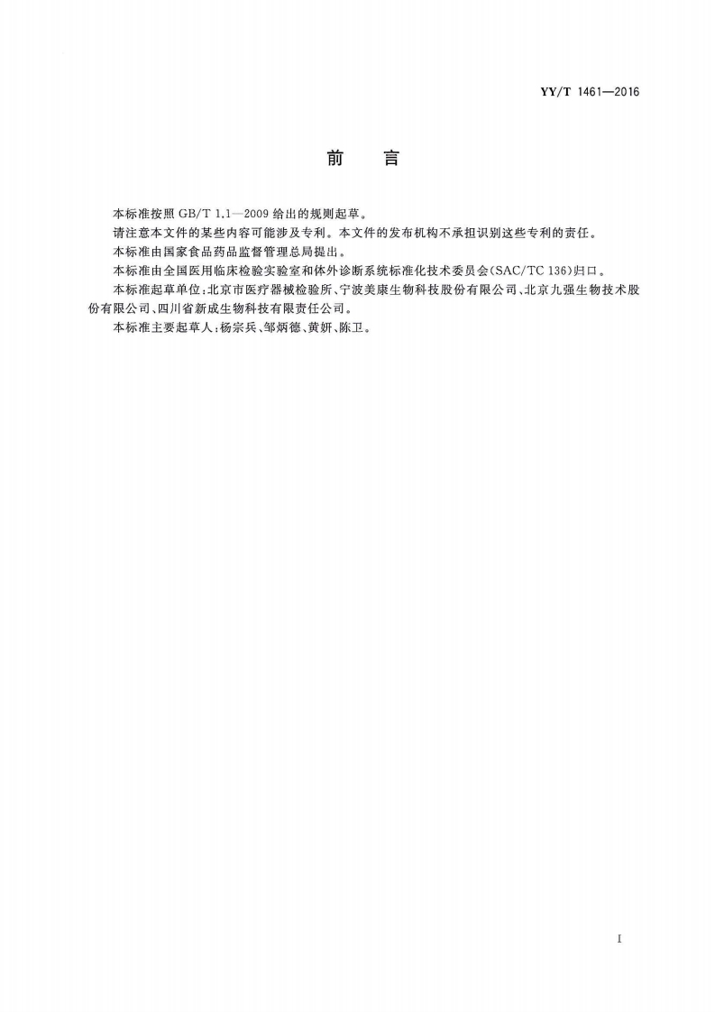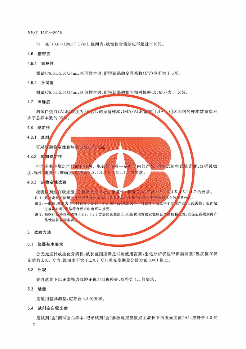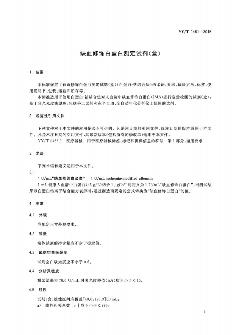 缺血修饰自蛋白测定试剂(盒)Ischemia-modifiedalbumintestreagent348072@abc5天前发布关注私信1.45MB9页049缺血修饰自蛋白测定试剂(盒)Ischemia-modifiedalbumintestreagent此内容为付费资源,请付费后查看¥13¥19黄金会员免费钻石会员免费立即购买您当前未登录!建议登陆后购买,可保存购买订单付费资源 第1页 / 共9页 第2页 / 共9页 第3页 / 共9页 第4页 / 共9页 第5页 / 共9页 试读已结束,还剩4页,您可下载完整版后进行离线阅读 THE END标准规范 文本预览 C41.10o1达YY中华人民共和国医药行业标准YY/T1461-2016缺血修饰白蛋白测定试剂(盒)Ischemia-modified albumin test reagent2016-01-26发布2017-01-01实施国家食品药品监督管理总局发布Φ 查看更多 收起部分 喜欢就支持一下吧收藏