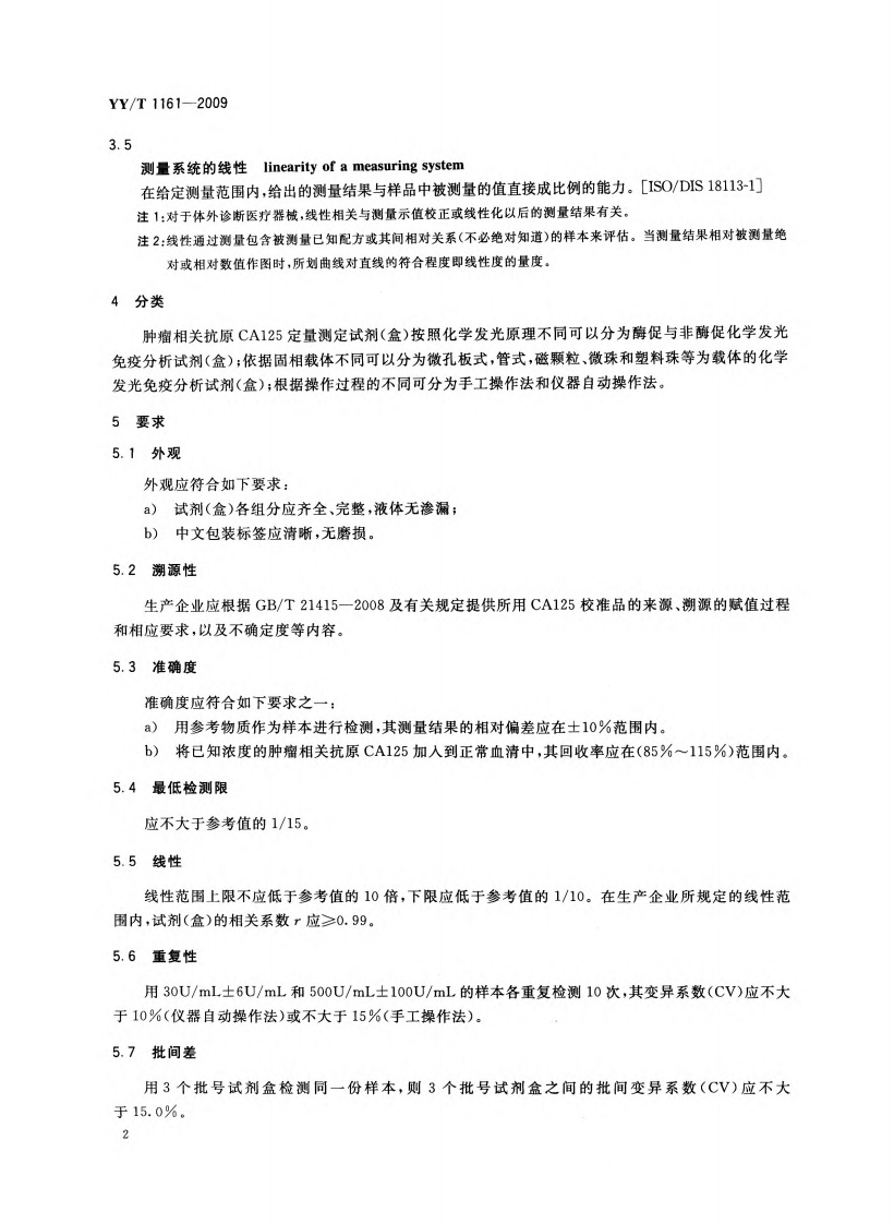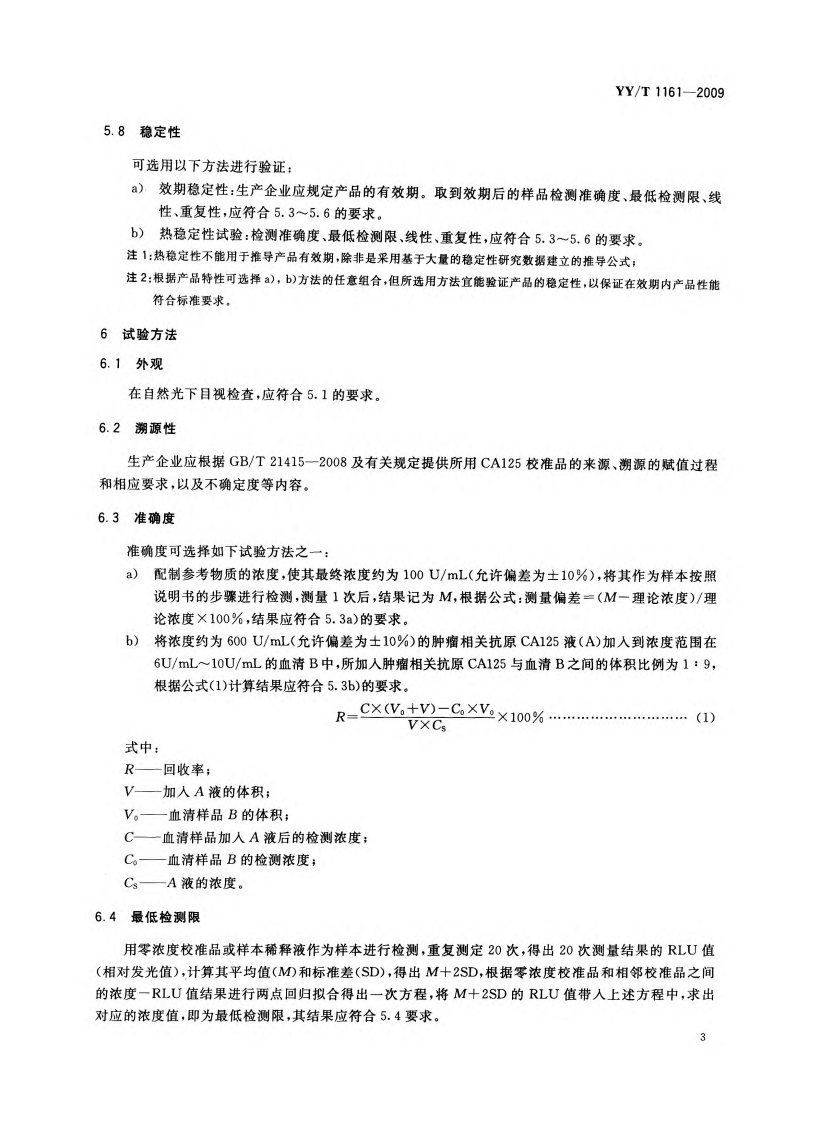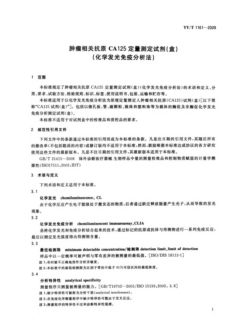 肿瘤相关抗原CA125定量测定试剂(盒)(化学发光免疫分析法)TumorAssociatedAntigenCA125QuantitativeDetectionReagent(Kit)(ChemiluminescentImmunoassay348072@abc6天前发布关注私信3.04MB10页024肿瘤相关抗原CA125定量测定试剂(盒)(化学发光免疫分析法)TumorAssociatedAntigenCA125QuantitativeDetectionReagent(Kit)(ChemiluminescentImmunoassay此内容为付费资源,请付费后查看¥13¥19黄金会员免费钻石会员免费立即购买您当前未登录!建议登陆后购买,可保存购买订单付费资源 第1页 / 共10页 第2页 / 共10页 第3页 / 共10页 第4页 / 共10页 第5页 / 共10页 试读已结束,还剩5页,您可下载完整版后进行离线阅读 THE END标准规范 文本预览 ICS11.100C44YY中华人民共和国医药行业标准YY/T1161-2009肿瘤相关抗原CA125定量测定试剂(盒)(化学发光免疫分析法)Tumor Associated Antigen CA125 Quantitative Detection Reagent(Kit)Chemiluminescent Immunoassay)2009-12-30发布2011-06-01实施国家食品药品监督管理局发布 查看更多 收起部分 喜欢就支持一下吧收藏