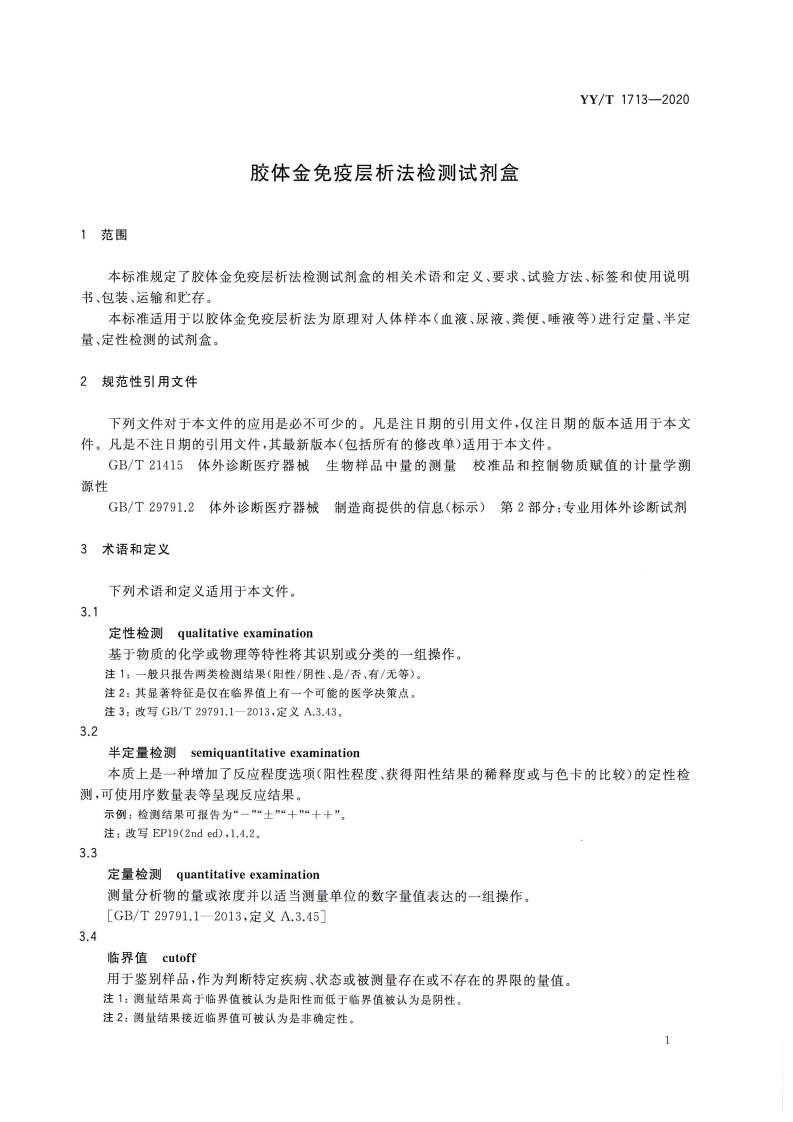 胶体金免疫层析检测诊断试剂套装348072@abc6天前发布关注私信6.20MB17页044胶体金免疫层析检测诊断试剂套装此内容为付费资源,请付费后查看¥13¥19黄金会员免费钻石会员免费立即购买您当前未登录!建议登陆后购买,可保存购买订单付费资源 第1页 / 共17页 第2页 / 共17页 第3页 / 共17页 第4页 / 共17页 第5页 / 共17页 试读已结束,还剩12页,您可下载完整版后进行离线阅读 THE END标准规范 文本预览 ICS11.100C44YY中华人民共和国医药行业标准YY/T1713-2020胶体金免疫层析法检测试剂盒Diagnostic kit for colloidal gold immunochromatographic assay2020-09-27发布2022-06-01实施国家药品监督管理局发布 查看更多 收起部分 喜欢就支持一下吧收藏