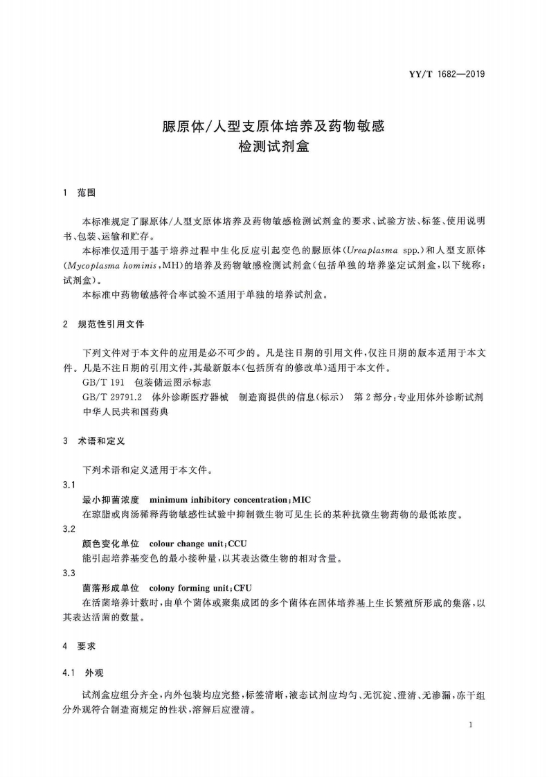 脲原体与人型支原体培养及药敏检测试剂盒348072@abc7天前发布关注私信1.91MB11页021脲原体与人型支原体培养及药敏检测试剂盒此内容为付费资源,请付费后查看¥13¥19黄金会员免费钻石会员免费立即购买您当前未登录!建议登陆后购买,可保存购买订单付费资源 第1页 / 共11页 第2页 / 共11页 第3页 / 共11页 第4页 / 共11页 第5页 / 共11页 试读已结束,还剩6页,您可下载完整版后进行离线阅读 THE END标准规范 文本预览 1CS11.040.40C407/YY中华人民共和国医药行业标准YY/T1682-2019脲原体/人型支原体培养及药物敏感检测试剂盒Ureaplasma spp./Mycoplasma hominis culture and antimicrobialsusceptibility testing kit2019-10-23发布2021-10-01实施国家药品监督管理局发布 查看更多 收起部分 喜欢就支持一下吧收藏